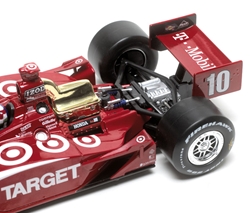 Greenlight’s model is an attractive reproduction of the Indy winner, with all the appropriate sponsor logos, from the main Target logo on the nose and sidepods, right down to the Huggies and Breathe Right stickers on the engine cover. Prominent on the air scoop above the driver’s head is the IZOD IndyCar series logo, the gas filler intake just below it on the car’s left side.