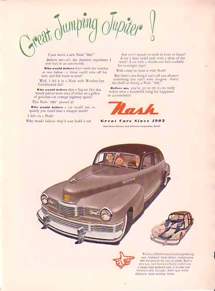 Nash Motors released their 600 in 1941 using unibody construction as opposed to body on frame. Because the body was constructed as a single unit, Nash produced a vehicle that was not only stronger, but about 500 pounds lighter than a traditional body-on-frame automobile. Ramblers were the first cars to use Unibody construction throughout their model lineup. The primary advantage of this technology is a stronger structure without the need for a separate chassis. With less squeaks and rattles, the overwhelming majority of contemporary automobiles, with the exception of trucks and some SUV’s, owe their design to some form of this 1960s cars’ original unitized body construction innovation.