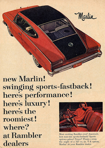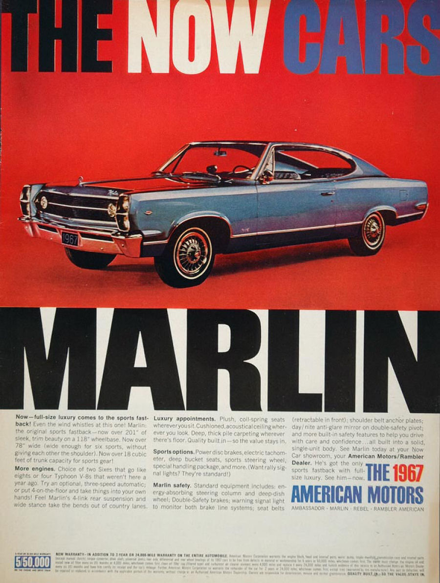 AMC billed the Marlin as a new addition to the company’s self-styled “Sensible Spectaculars” model line and instead of competing with the Barracuda, it went head to head with the Charger. Backed by extensive advertising and merchandising, the car was officially announced on February 10, 1965, and unveiled in Rambler dealer showrooms on March 19. Teague was still not
