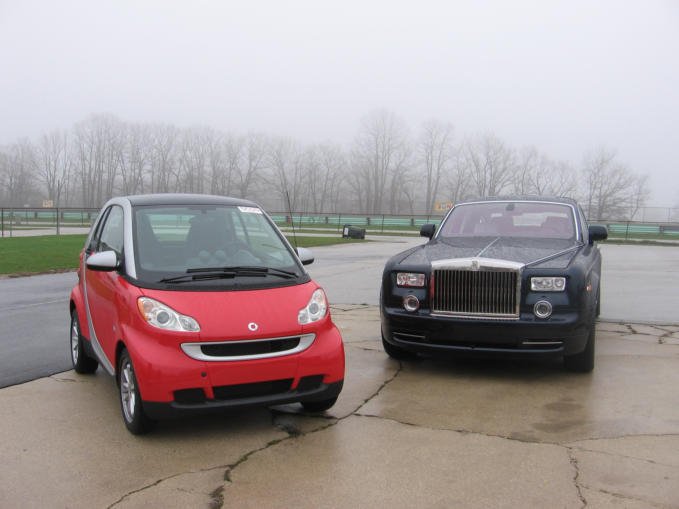 What could better bookend the car world than a Rolls Royce and the Smart car? I was about to drive this red Smart for 2 model home a couple years ago from a media event at Wisconsin’s gorgeous Road America racetrack. It was a rainy day and the Rolls Royce that had been sitting in the paddock all day was about to be loaded onto an enclosed truck when my photographer’s eye said this would be a fun photo. Hope you enjoy it!