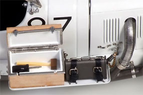 Small metal clasps also hold the hood down and on the passenger’s side three giant exhaust pipes exit into the larger pipe that runs under the car. Next to the passenger/mechanic’s seat there’s a tray outside the car that carries a tiny wooden toolbox, and yes it opens to reveal a couple screwdrivers, wrenches and a mallet. Next to the toolbox is a fuel can with metal chain to hold the cap and leather straps to keep it on the car.