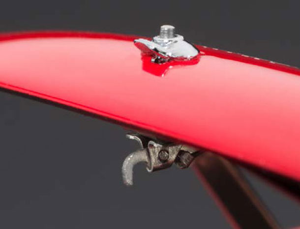 The Ferrari’s undercarriage is expertly detailed with proper brake lines and a full cylindrical spring suspension and realistic brakes. Wheels are branded Michelins and are fully removable, with locking wheel nuts that really work. Of course the front wheels also are steerable and in back are two sets of chrome dual exhausts, hinting at what must have been a beautiful exhaust note on the California. Next up, 1:18-scale engines that really run?