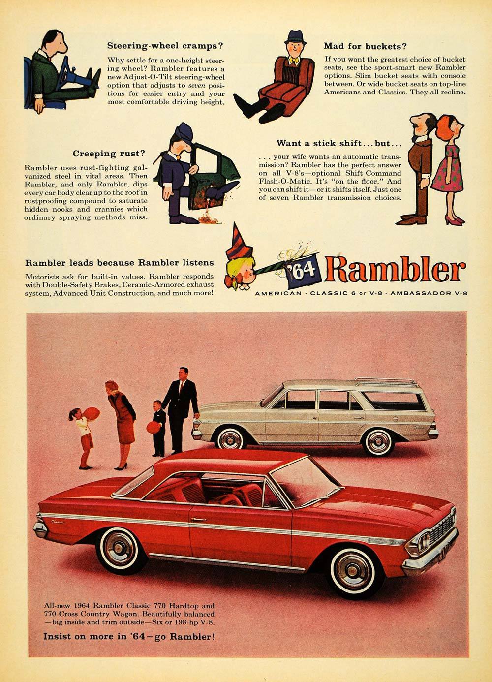 Like any car guy I subscribe to a lot of newsletters. I like to keep up on what’s new, what’s cool, what’s fast:), and collector cars, mostly from the the 60’s and 70’s. This week I received my AutoWeek newsletter, parused it, and low and behold came across this car. Now of course being an AMC geek I took a closer look at the ’64 Classic 770 Cross Country wagon. Since it usually was cash-strapped, AMC knew the could not go head to head with GM, Ford, and Chrysler so they found a segment the Big Three weren’t in. BTW, did you know that in 1962, Rambler was N0. 1 in station wagon sales?
