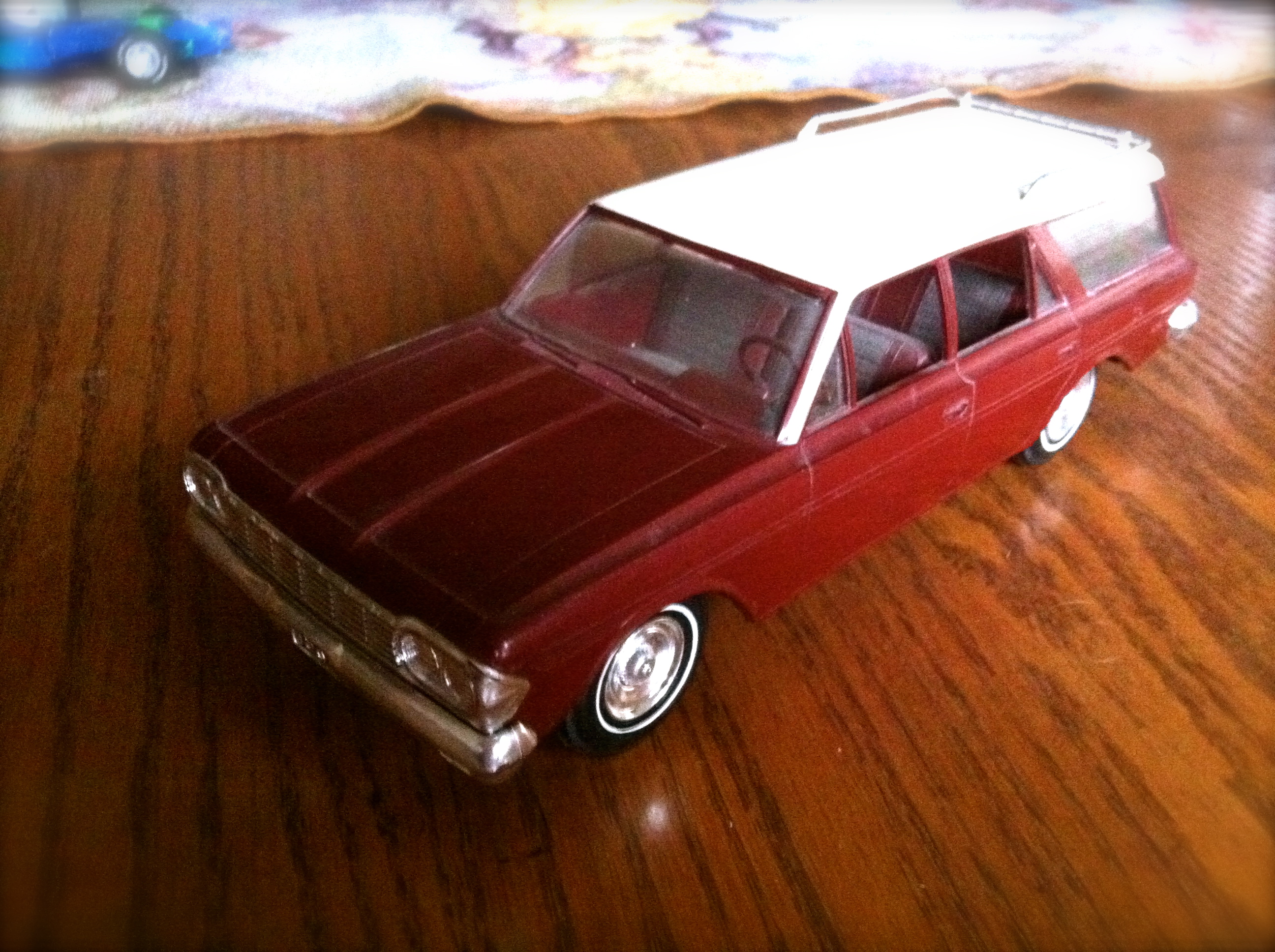 So here’s my promo model, a two-tone, white over maroon. I’ve had this car for a very long time as you can see by the dust on it. I’m not sure if it was one my dad brought home when he worked at AMC or I bought it at a swap. I do remember seeing these at swap meets. Examples of good ones like mine go for around $50. I was only able to see one on eBay and the current bid was around $35. I did see a ’63 Classic Sedan with a current bid of $90. I have one of them too. A few years back, my dad and I were at the American Motors Owners Association event in Kenosha, where most of the AMC’s were built, and there were some vendors selling the promo models. I was talking to a couple of guys, one who was into collecting promo models year by year and all the colors they came in while the other was collecting just the wagons which I have. Thinking back now to when I was kid, dad brought some many promo models home, many free while some others he paid 2 bucks for, 2 bucks! Quite a few of those were either burned or blown up in my driveway.
