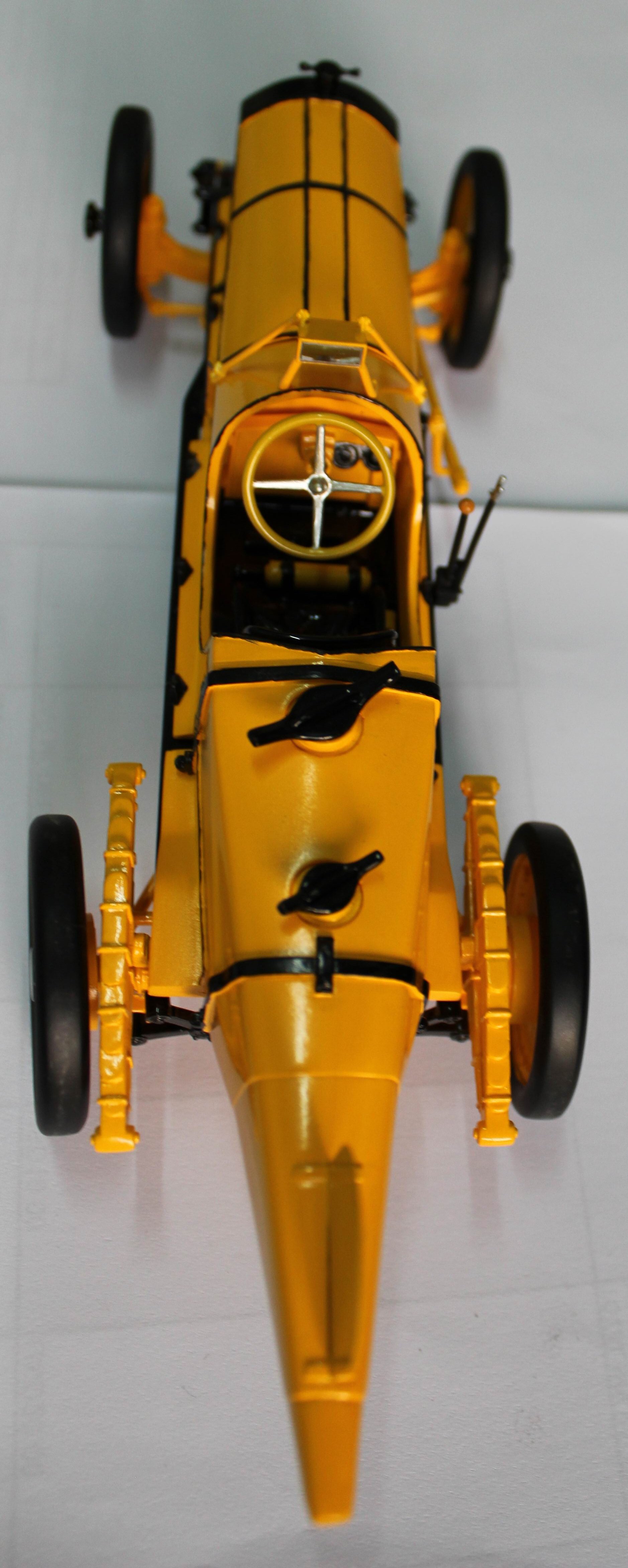 Don’t want to brag here, but I’ve got some sneak peak shots of the Replicarz 1:18 Marmon Wasp model that should be released in the next several months.The Wasp, with its distinctive yellow color and pointed tail (wonder how it got the “wasp” nickname?), was the only single-seat car in the inaugural 1911 Indianapolis 500. And Ray Harroun, a Marmon test driver and racer, won that rough and tumble first race for the Indianapolis-based car maker.