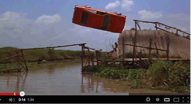 Who doesn’t love a good car chase? Show of hands. Yup, that’s everybody. Good car chases are a big part of a movie. Perhaps the first one that comes to mind is the classic chase in Bullitt. Now think Bond, James Bond. Super awesome car chases in those movies but because, as you all know, I have this sick love affair for AMC cars, I remember the 1974 AMC Hornet in The Man with the Golden Gun. The action begins as secret agent 007 commandeers the Hornet from a dealership in Bangkok with a vacationer who was looking at the car. The Hornet performs an “airborne pirouette as it makes a hold-your-breath jump across a broken bridge“. Of course the stunt car is significantly modified with a redesigned chassis to place the steering wheel in the center and a lower stance, as well as larger wheel wells compared to the stock Hornet used in all the other movie shots.