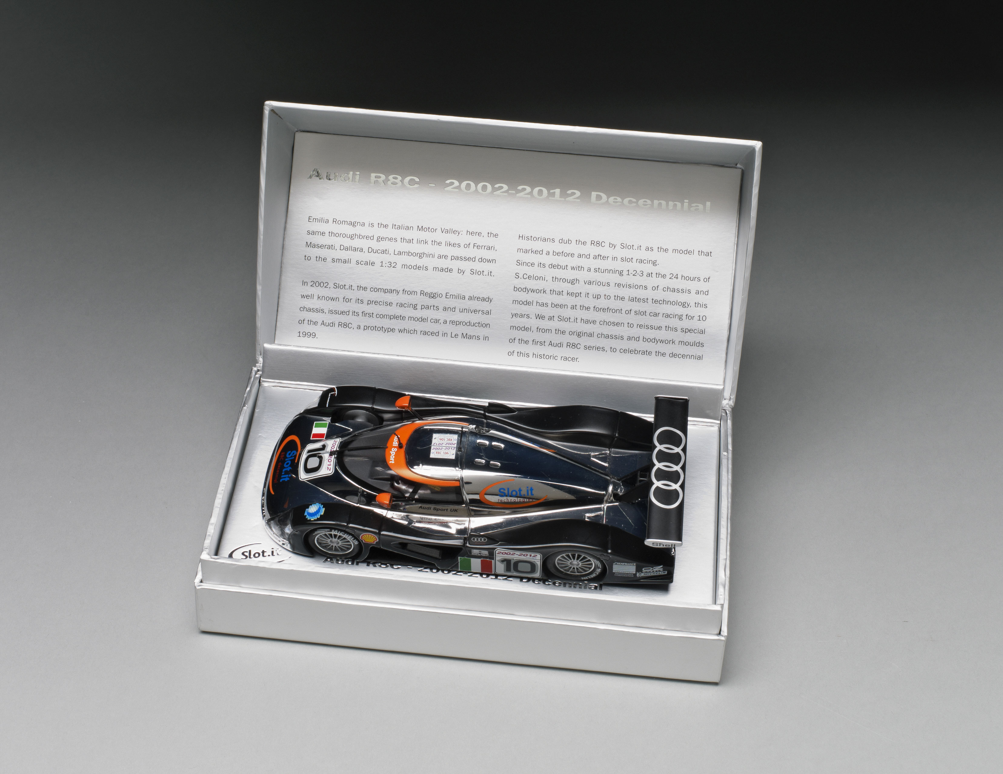 There’s plenty of competition in the slot world, with well-established players. … BUT Slot.it DID make a go of it, and now celebrates its 10th anniversary with the reissuing of its original Audi R8C LeMans racer. When first launched it was rare for a slot car maker to have such a new model, as the car had raced at LeMans in 1999.