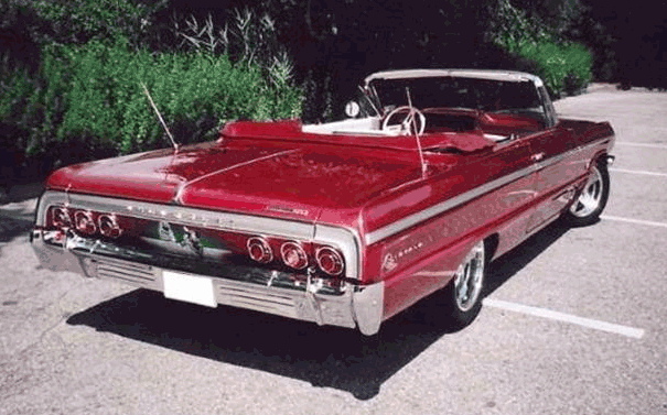 This ’64 was one of the third generation (’61-’64) cars. The new body styling was more trim and boxy than the 1958–60 models. Sport Coupe models featured a “bubbleback” roof line style for ’61, and a unique model, the 2-door pillared sedan, was available for 1961 only. It was rarely ordered and a scarce collectible today. The rare Super Sport (SS) option debuted for 1961. These cars, remember it’s the 60’s had huge V8’s in them such as the 409 and the Beach Boys produced a hit single about that engine. I have it on my iPhone. The Beach Boys produced a hit single, “409,” referring to the Chevy, which became an iconic song for these cars. What set the Impala apart from others in the Chevy lineup? They featured premium interior appointments, plusher seats, and more chrome trim outside, including a full-width aluminum-and-chrome panel to house the now famous triple-unit taillight assembly. SS models featured that panel in a special engine-turned aluminum, which was also used to fill the side moldings, making the SS more distinctive in appearance.