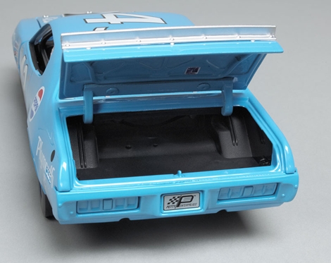 There’s also a flat scoop under the nose that both aided cooling and down force to keep Sir Richard glued to the ovals. Naturally the red and black V8 under the hood looks good, with red plug wires, but I wish you could raise the hood a little higher to display the model with its hood up.Yet the exterior is what you’ll likely enjoy the most, and it’s well executed with realistic sponsor decals and logos. Racers weren’t coated in sponsor attire so much in 1971, but there’s a white Plymouth by Petty decal on the rear quarter panel, plus smaller STP, Union 76, Wix filters and Hooker Headers logos, plus a bigger Pepsi logo just below the C pillar.