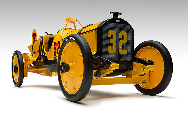 Overall the model, bathed in a bright school bus yellow paint job (again as the car now appears in the museum), creates a stunning display. Folks will ask you about this one if you display it in your office or living room. This one is special, and not just because it’s the first Indy 500 winner, but because of its stunning shape and appearance. The fine paint job along with the red and black trim lines makes it all the more spectacular under close inspection.