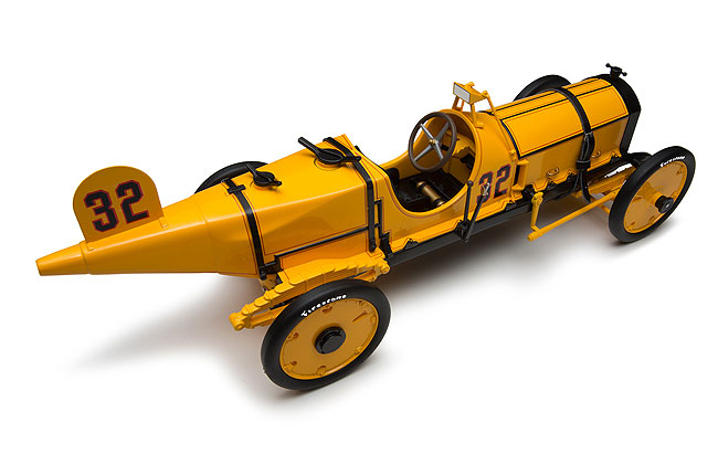 Remove the hood and there is a finely honed resin version of Marmon’s 6-cylinder, 7.82-liter engine, ith wired sparkplugs and mint green headers. You also can see the steering box and how it connects via an external steering arm that goes to the front wheels. Again there are yellow leaf springs up front and I love the black grille with Marmon logo and the No. 32 emblazoned on the grille’s face. There also is a crank on the nose, with yellow handle, the racer’s starter.