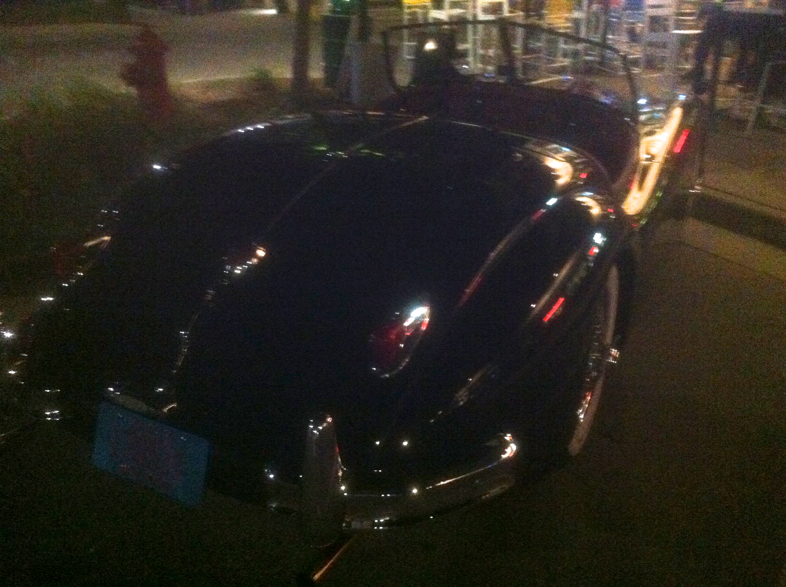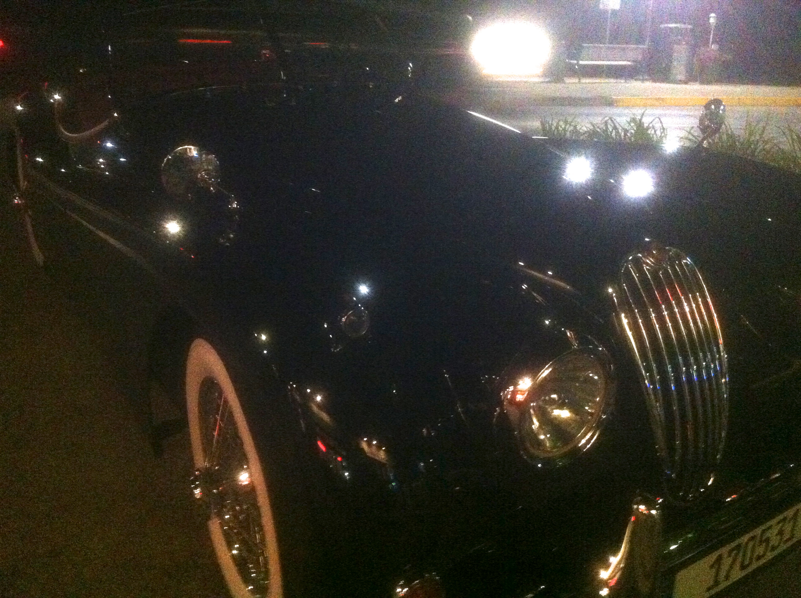 while I’m looking at the road. So one night we come out of the ice cream shop and what parks right in front of me but this 1961 Jaguar XK-150 convertible. Sorry for the darkness of the images. This model represents the ultimate development of the XK-series cars prior to the advent of the XK-E. Three SU carburetors feed the 3.8-liter engine with valve actuation by dual overhead camshafts and a Weslake-developed ‘gold’ cylinder head. It is virtually identical in all specifications to the XK-E