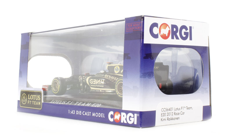 That’s a short history of what brings us to Corgi’s smartly executed 1:43 version of the Lotus E20, raced in 2012 by former F1 champion Kimi Raikkonen of Finland. Corgi delivers a beautifully rendered Lotus, and also offers the team car driven by France’s Romain Grosjean in the 2012 season.