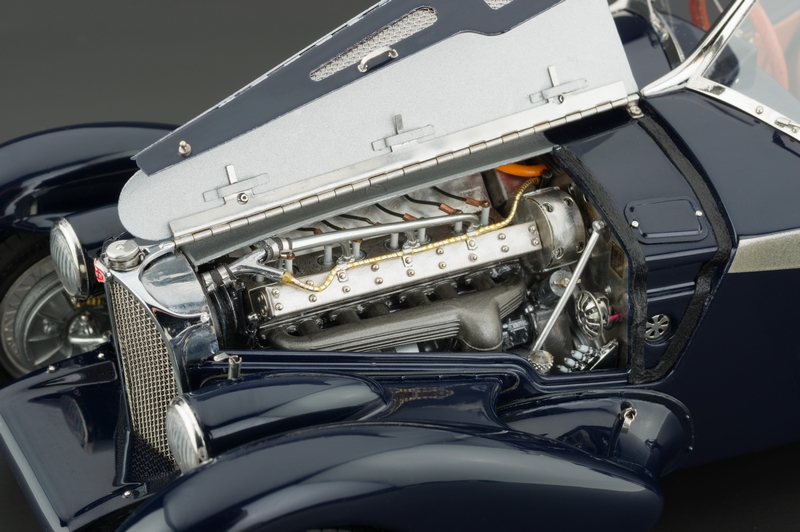 The center-hinged fold-up bonnet, or hood, is perfectly executed too, with small functional metal clips that hold it in place. Unlatch them and the hood folds up just beyond halfway over the massive inline 3.3-liter, 8-cylinder engine. In the original, the straight 8 created more than 200 horsepower, being based on Bugatti’s race proven engine in its Type 51 racer.
