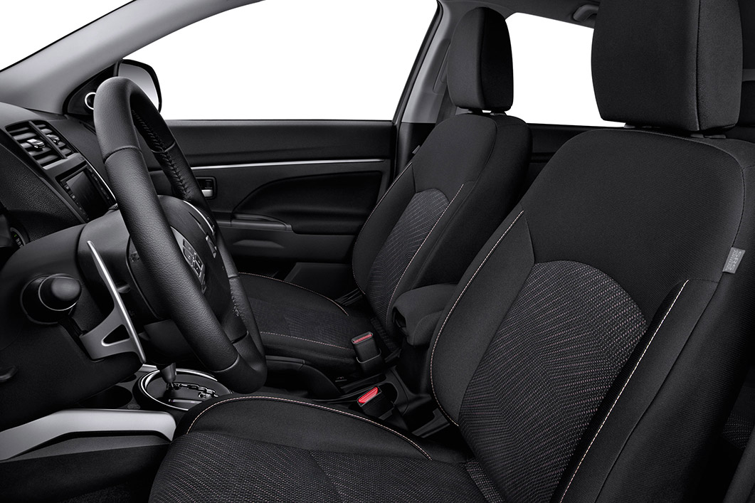 Mitsubishi also puts the cruise control on its tilt/telescope steering wheel hub and the wheel has a leather wrap. Other features include push-button start and a trip computer accessed via a dash button to the left of the wheel. The Sport also has three cupholders on the console up front, and two in the rear seat fold-down center armrest.