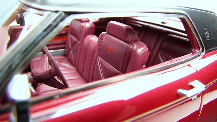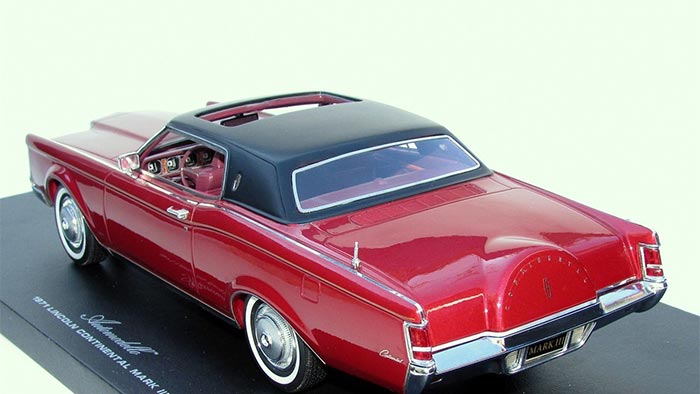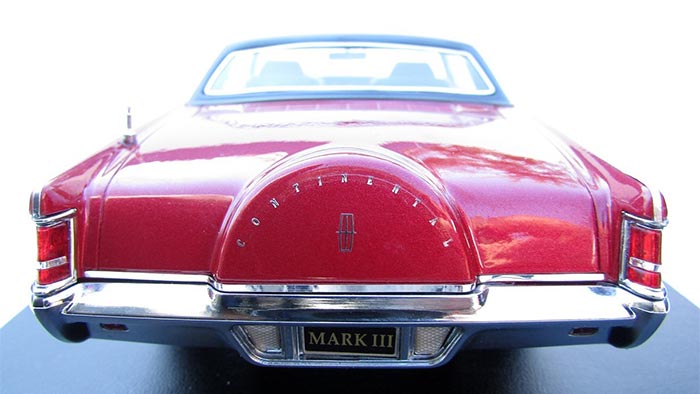 I like the bright metallic “red moondust” paint scheme that makes this pop on display. Plus Automodello creates a flat black mock vinyl roof with open sunroof, a fun feature introduced on the Mark III in 1971. Lincoln made the Mark III from 1968 through 1971.