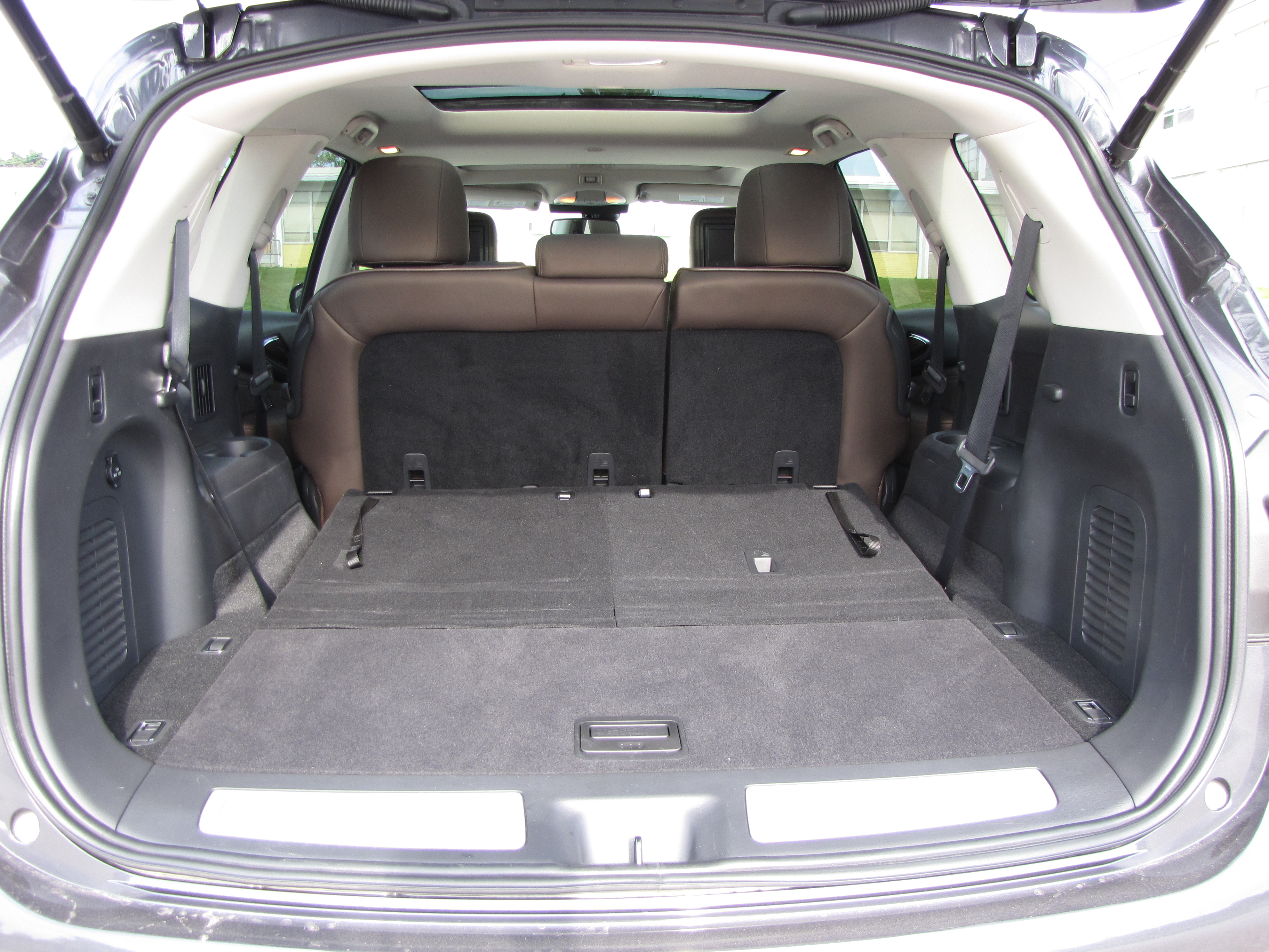 Misses: Button crazy center stack like former FX models, acceleration lags as CVT hunts for proper gear ratio, beeping lane departure system annoys when on, hard for short driver to enter vehicle as it’s a tight squeeze for knees. Third row seat is cramped.