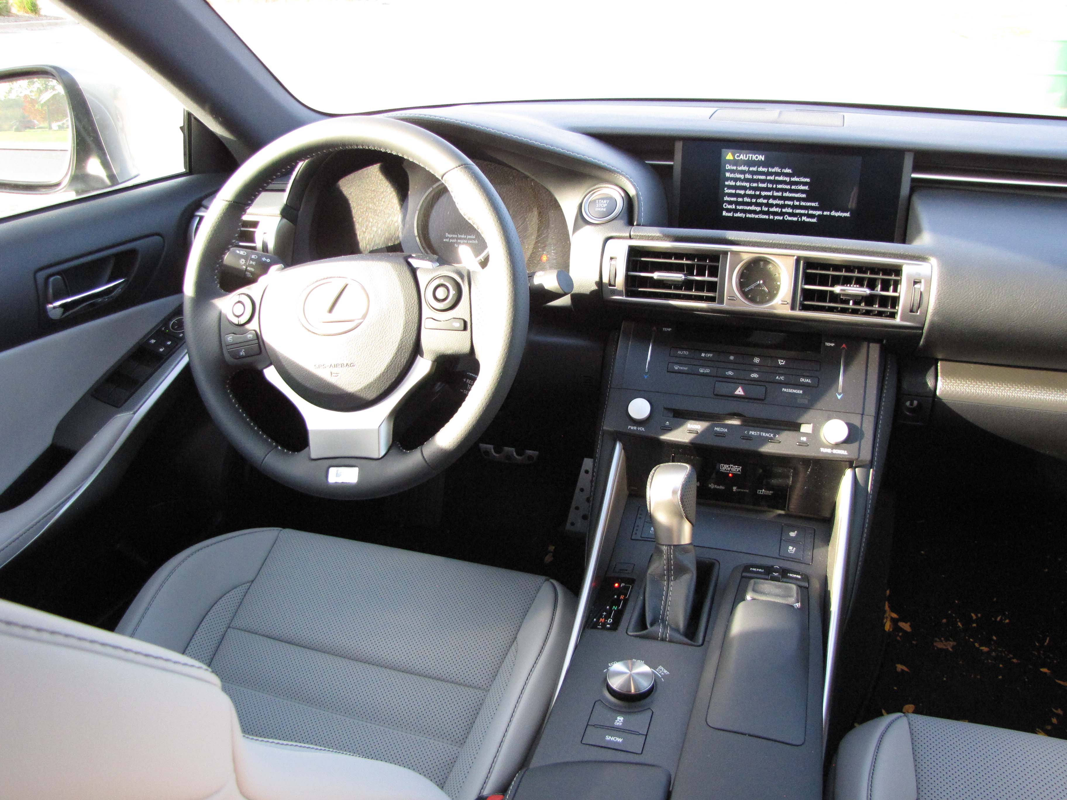 The test car’s dash was black leather with fake carbon fiber trim on the passenger’s side and the armrest tops. Other trim is matte silver, such as around the air vents and the steering wheel is a power tilt/telescope model ($400 extra). That helps, but for short drivers it’s a tight squeeze getting in and out if you don’t set the steering wheel at a high angle. The IS screams for a flat-bottomed steering wheel to allow more leg clearance entering and exiting. Otherwise it’s not in the way.
