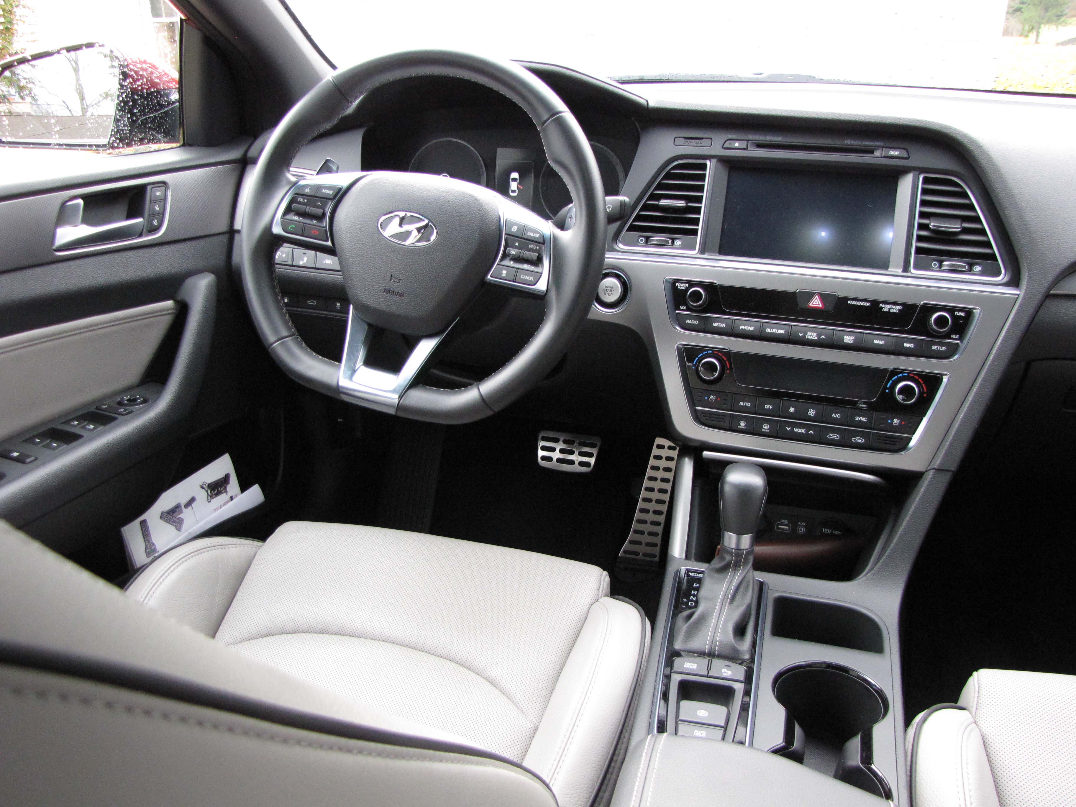 Consider that the Sport 2.0T comes with leather seats, the test car’s being medium gray with darker gray piping and dark gray dash with carbon-fiber look trim that extends to the doors. Other trim on Sonata’s center stack buttons and the door release are matte metal-look and overall the car’s dash reflects entry-level luxury.