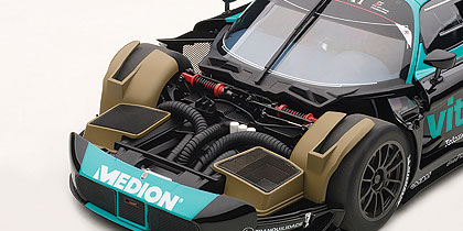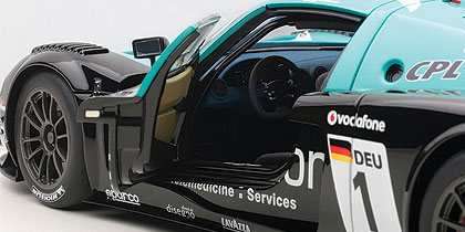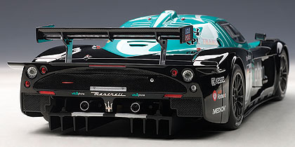 Autoart knows that and introduces another stunning Maserati model in 1:18 scale, this one the racing version of Maserati’s two-seat supercar, the MC12. The review car is the 2010 FIA GT1 Champion in the beautiful turquoise and black Vitaphone Racing Team livery.