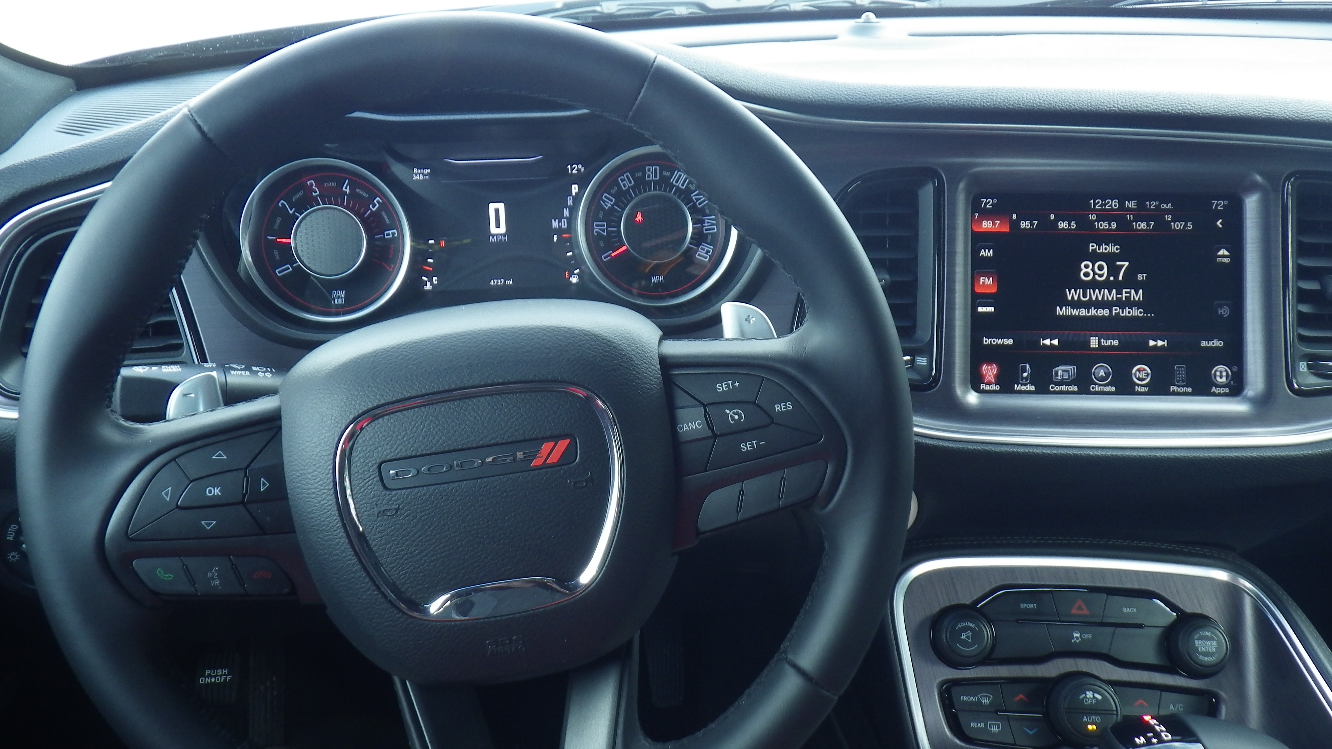 The $1,400 Super Sport Group that gives this model its larger tires and wheels and performance brakes also puts paddle shifters behind the steering wheel for manual shifts, plus adds a body-colored rear spoiler. Another option adds body side stripes for $395 and a Uconnect package at $995 delivers that big nav/radio screen along with the navigation system, HD radio and Uconnect infotainment.
