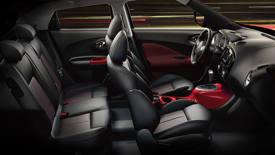 Inside, the test Juke featured black perforated leather seats with red stitching and red that barely shows through the perforations. There also are red door armrests and console and black and red cloth door inserts to liven up the otherwise black interior. Most trim on the gauges, steering wheel hub and air vents is matte silver. Doors feature chrome look door releases.