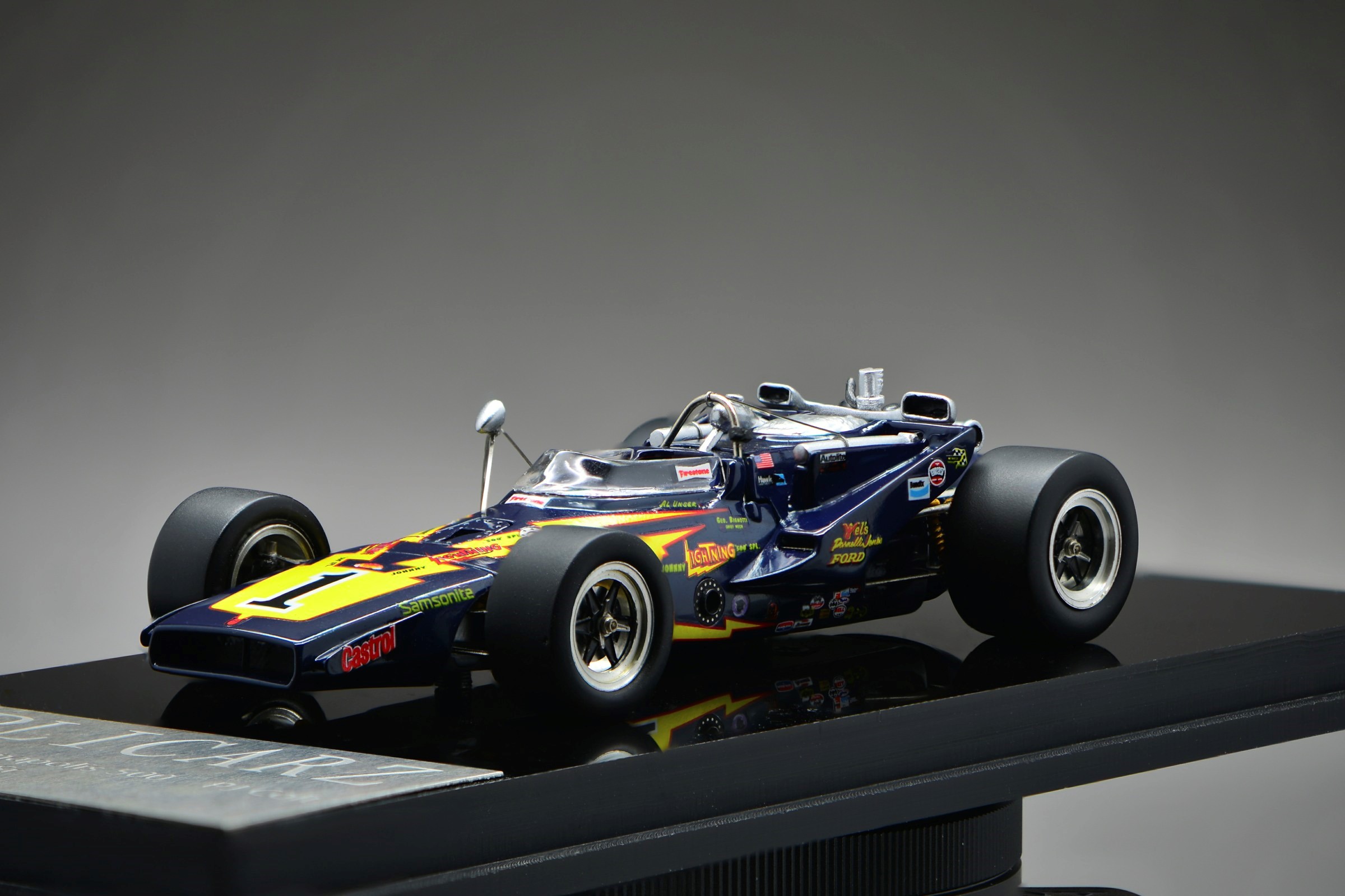 Al Unser’s name, along with that of Chief Mechanic George Bignotti, are printed on the cars’ sides. And the racers ride on brushed-metal look wheels with knock-off central spinners and Firestone branded black slicks to give the cars a realistic race-morning look.
