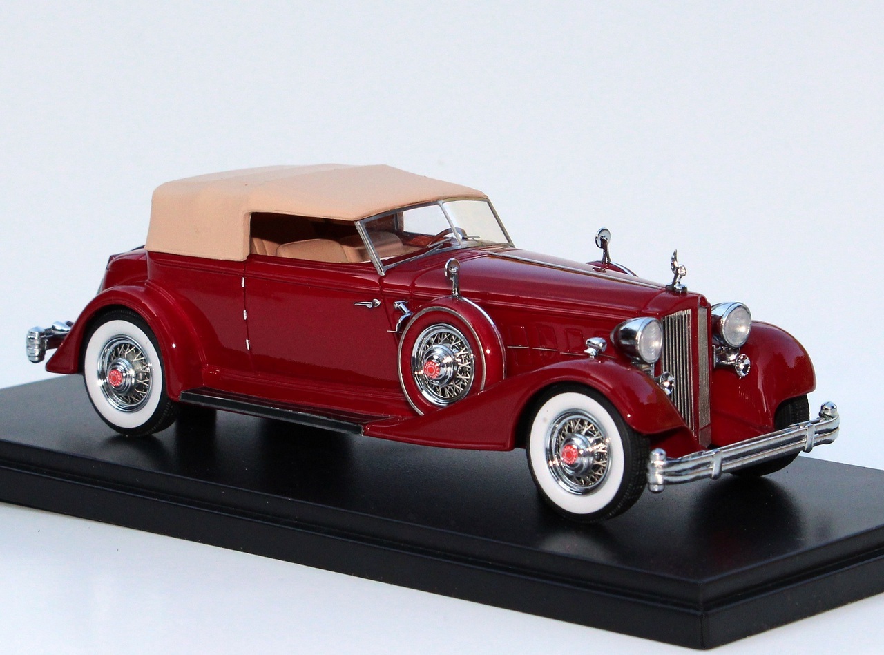 The main offering here is a brilliant deep red Packard with tan convertible top and a separate tonneau cover to use if you prefer to display it with the top down, an excellent choice. The tonneau fits well and since this comes in a sturdy acrylic case it will remain dust free if displayed that way.