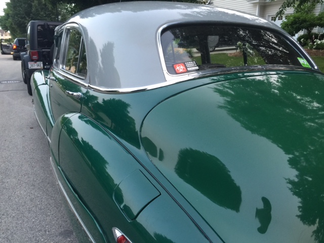 And what inspired me for this blog entry? My head’s always on a swivel when I’m driving or riding and while I was in a northern suburb of Milwaukee I spotted an old large green car. Not wanting to go past, I turned around because, well I’m a car guy. I think this is a ’53 because my uncle Walter had one. To ride in that car was like putting your living room on wheels. It cost him what was a ton of money then, something like 5,400 bucks. Yup, you were somebody if you were seen in one of these. This one was in mint condition. And of course what really caught my eye was the crazy thing hanging out the passenger window. Now it was all coming back because my uncle had one on his Buick. This is the precursor, to what we now