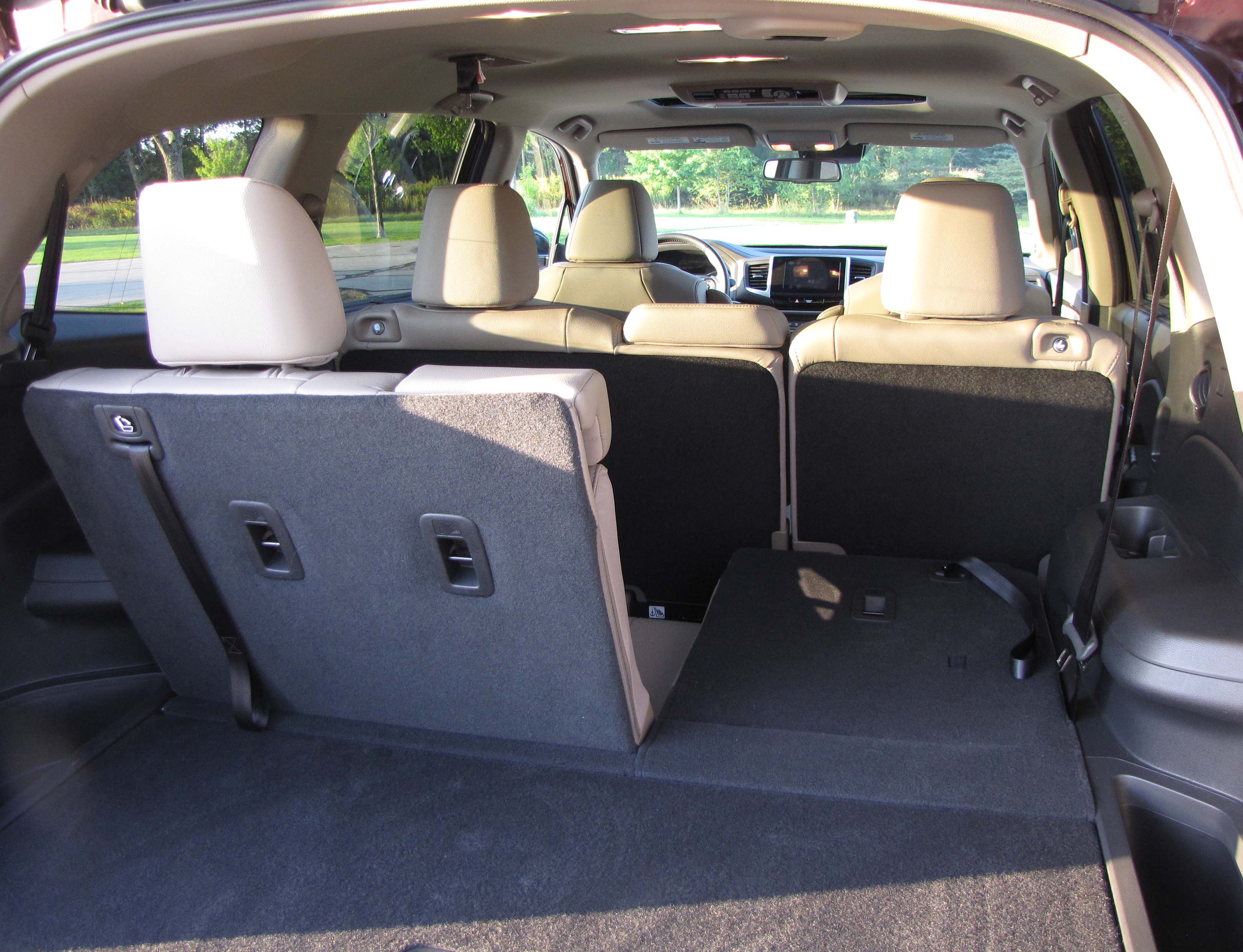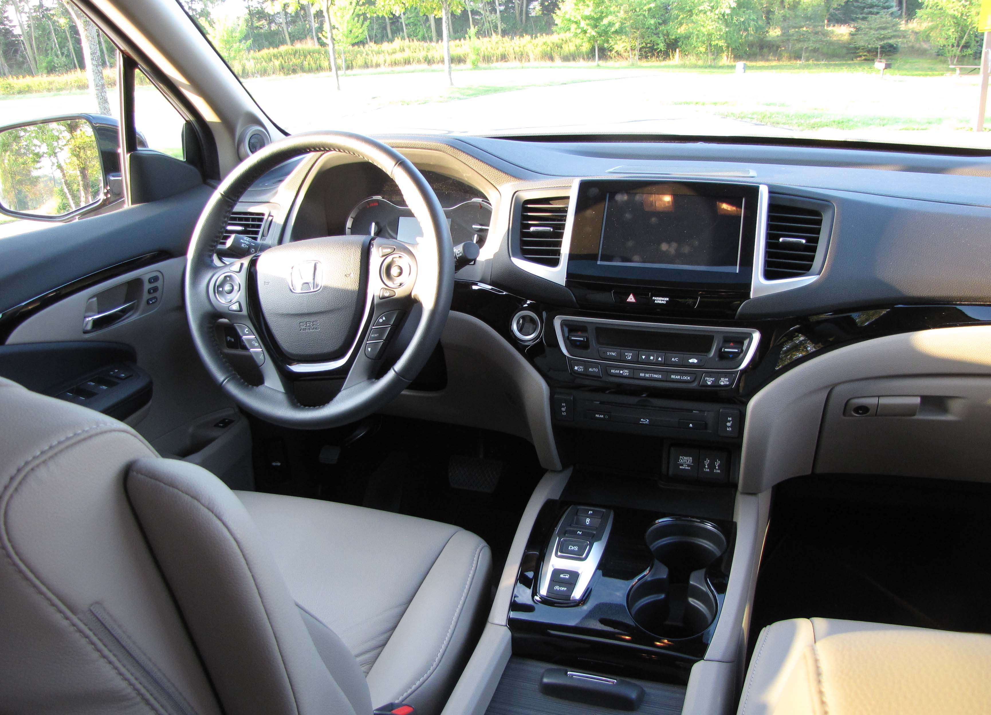 The big touchscreen for nav, audio and rearview camera is easy to use and this model featured a fold-down screen and entertainment system for the second row along with two wireless headphones. Grandkids love this stuff! Pilot also is loaded with electrical hookups, including 5 USB ports and a couple 12-volt outlets.