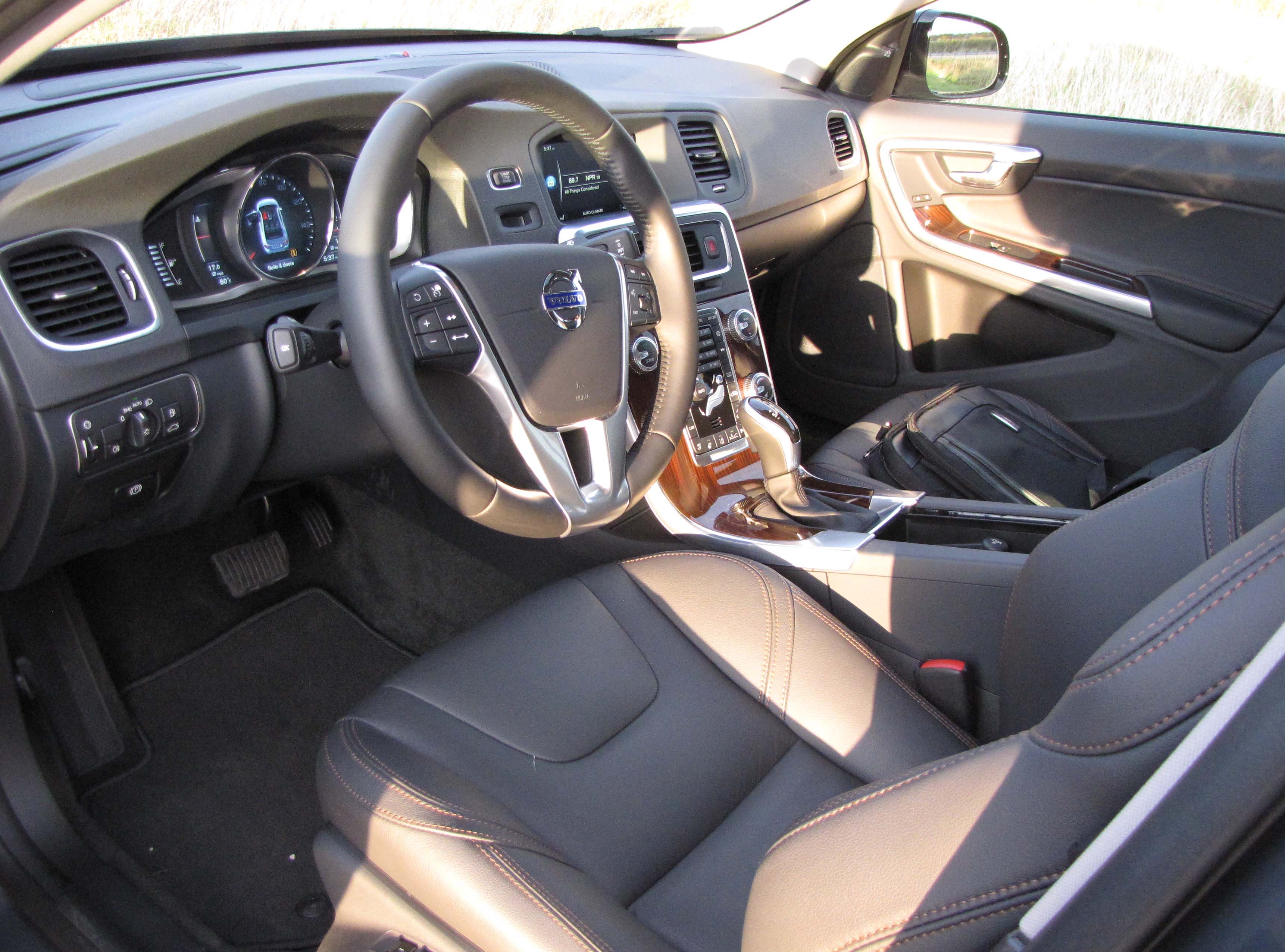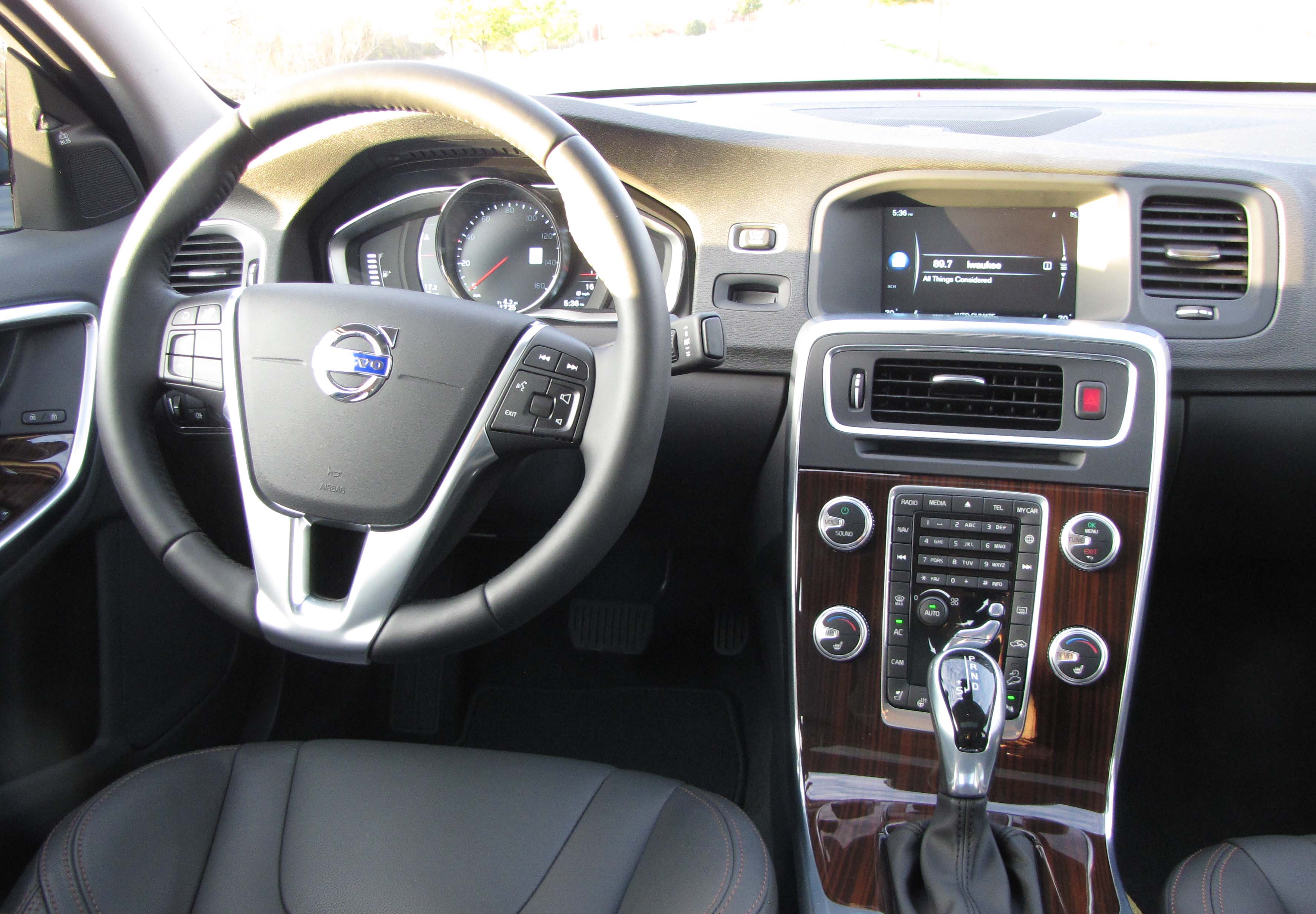 The Volvo’s interior looks classy. The pewter paint schemed test car featured dark gray leather interior with redish brown stitching, a gray leather steering wheel, brushed metal trim in an edgy pattern on the doors and similar trim around the dash gauges and center stack, plus “urbane wood” inlays by the console shifter and on the doors. The wood costs $400 extra.