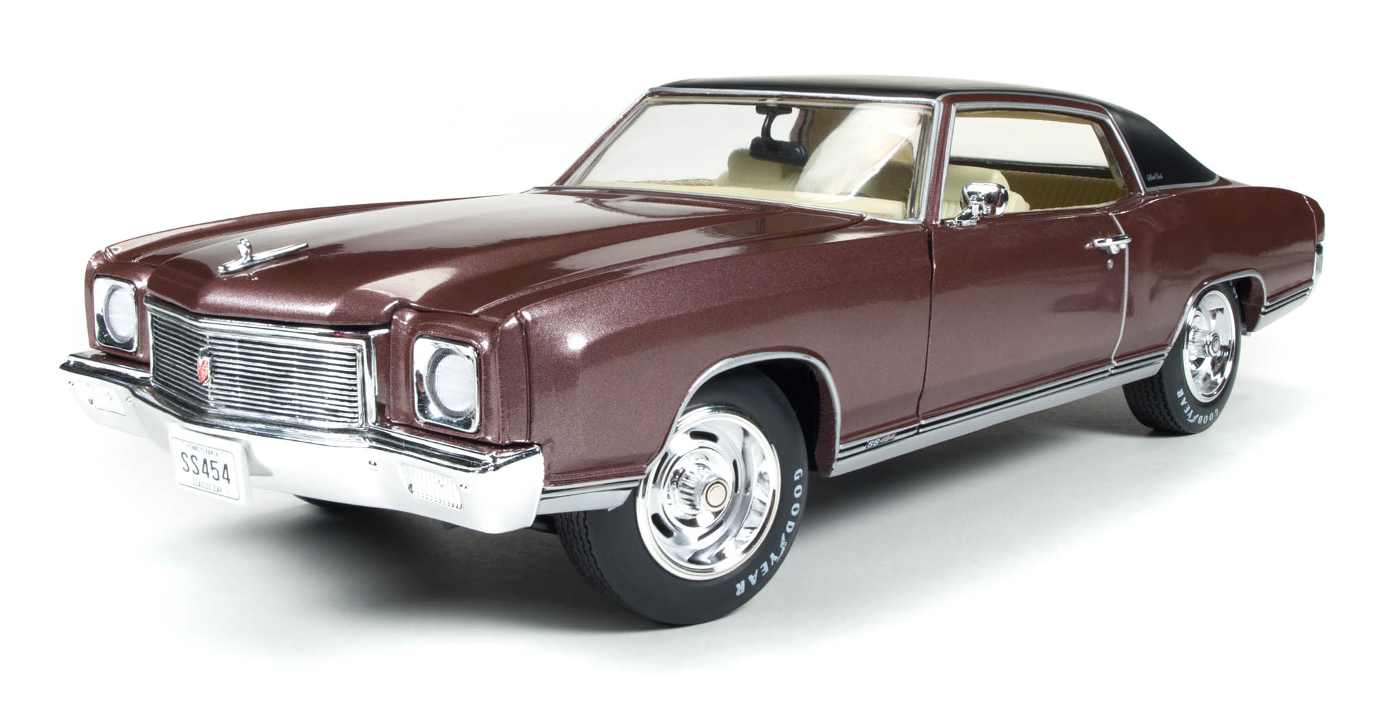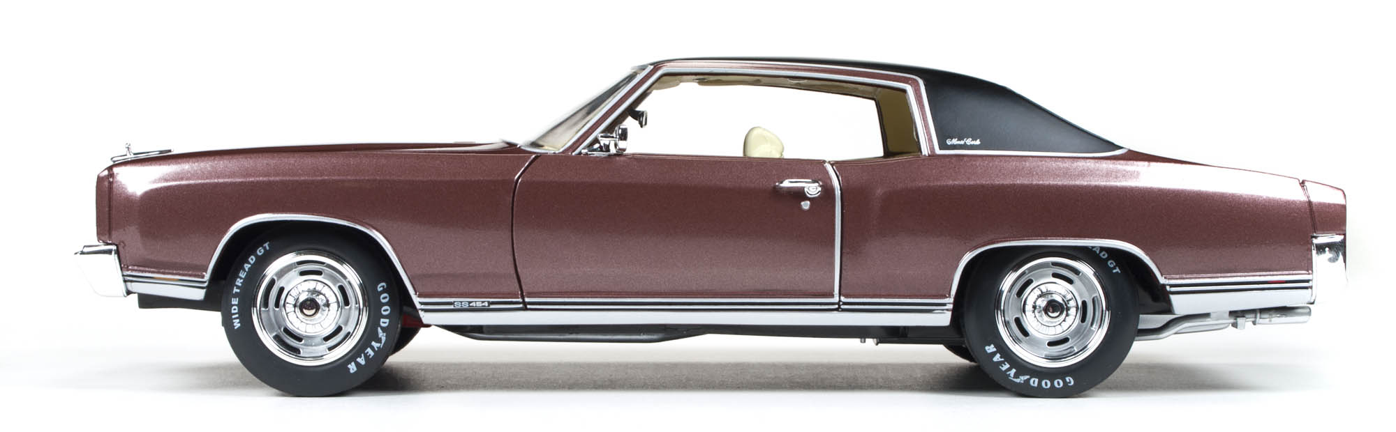 Auto World now fills the Monte Carlo void for 1/18 scale model lovers and does it with a fine looking SS model in Rosewood Metallic, a dark, nearly maroon, red.