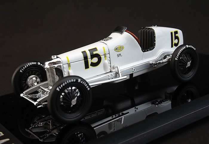Both of these new Millers are similar, as both are bright white with simple markings, as was common in the day. The 1926 winner was entered by Miller with Frank Lockhart as the driver. This model features a black No. 15 and a simple cream-colored oval with “Miller” in black lettering on the cowl, just in front of the cockpit and below the windscreen.