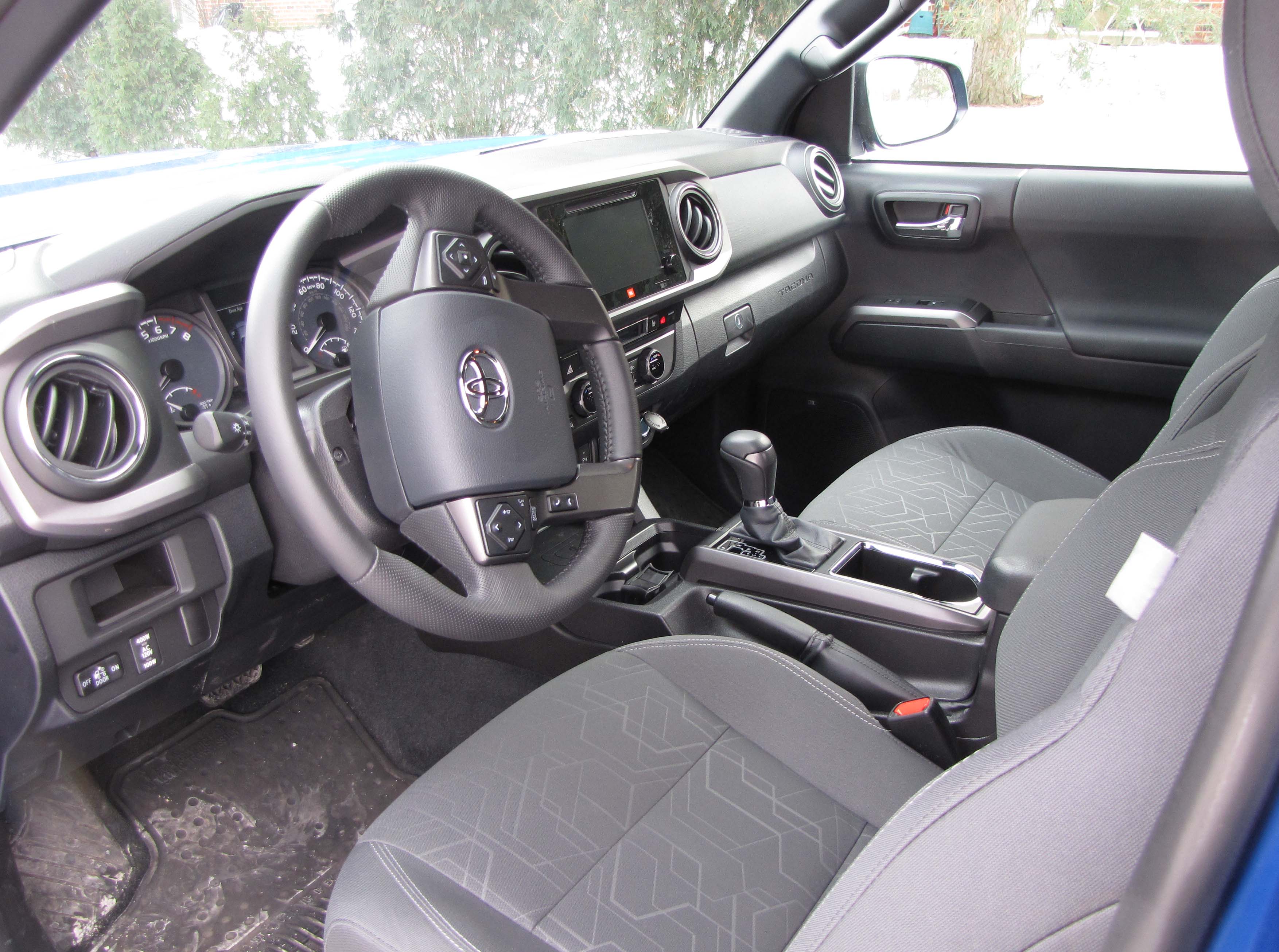 Good news is that four adults will fit in the 4-door double cab with the rear bench being fairly comfortable. The manually adjusted front seats (power seats are not available in any Tacoma) certainly are well shaped and comfy. Toyota also delivers a nicely laid out dash with round main gauges and digital readout between them, plus a moderate sized touchscreen for the radio and navigation system, plus this one includes satellite radio.
