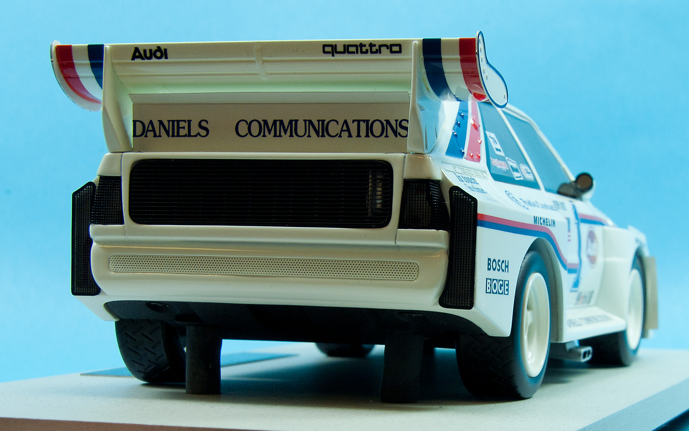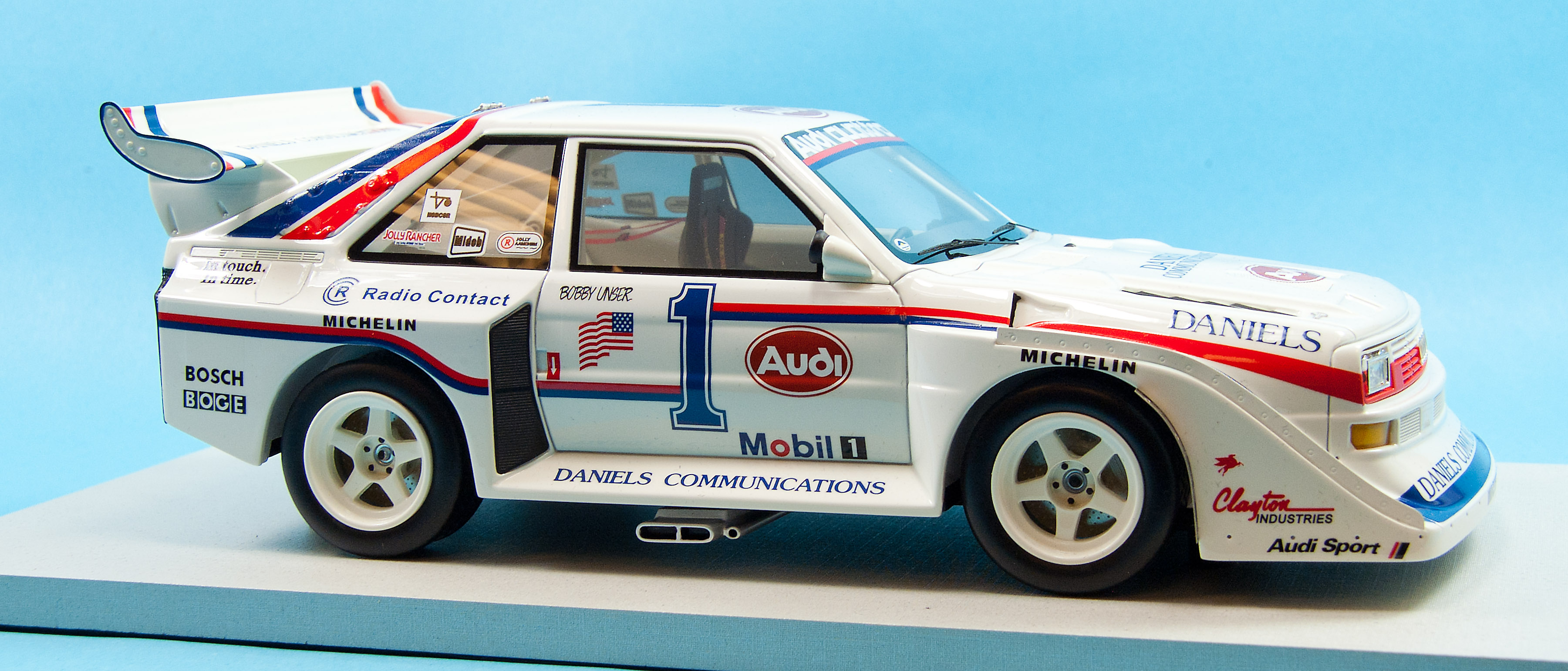 Comparing the model to photos of the race car it appears every sponsor decal and trim paint is perfectly executed, including an American flag decal reversed on the passenger’s side door and Bobby Unser’s name on each side under the window. Daniels Communications was a major sponsor and its logo along with Audi, Mobil 1, Bosch, Clayton Industries, Michelin and Boge are all on board.