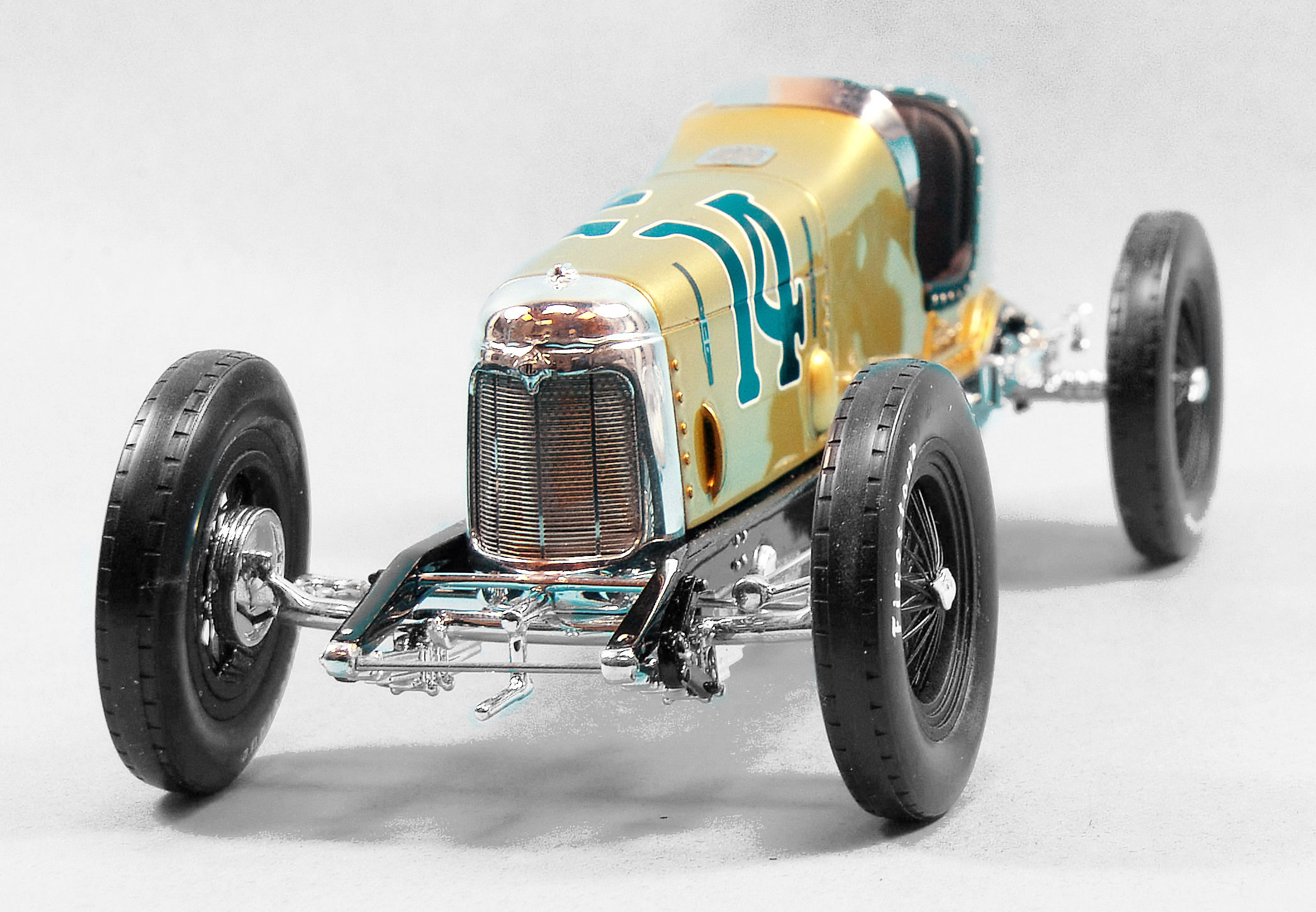There are big black balloon tires with the Firestone logo printed on them and the black wire wheels with silver winged spinners look realistic. Up in front of that silver etched metal grille is a hand crank, which is how they fired these beasts at the time, plus chrome-plated suspension and steering arms. Replicarz puts a photo-etched grille just in front of the cockpit atop the racer’s body and the silvered windscreen appropriately wraps in front of the steering wheel and down the car’s left side to the edge of its matte black leather-look seat, which itself has silver button snaps trimming its edge.