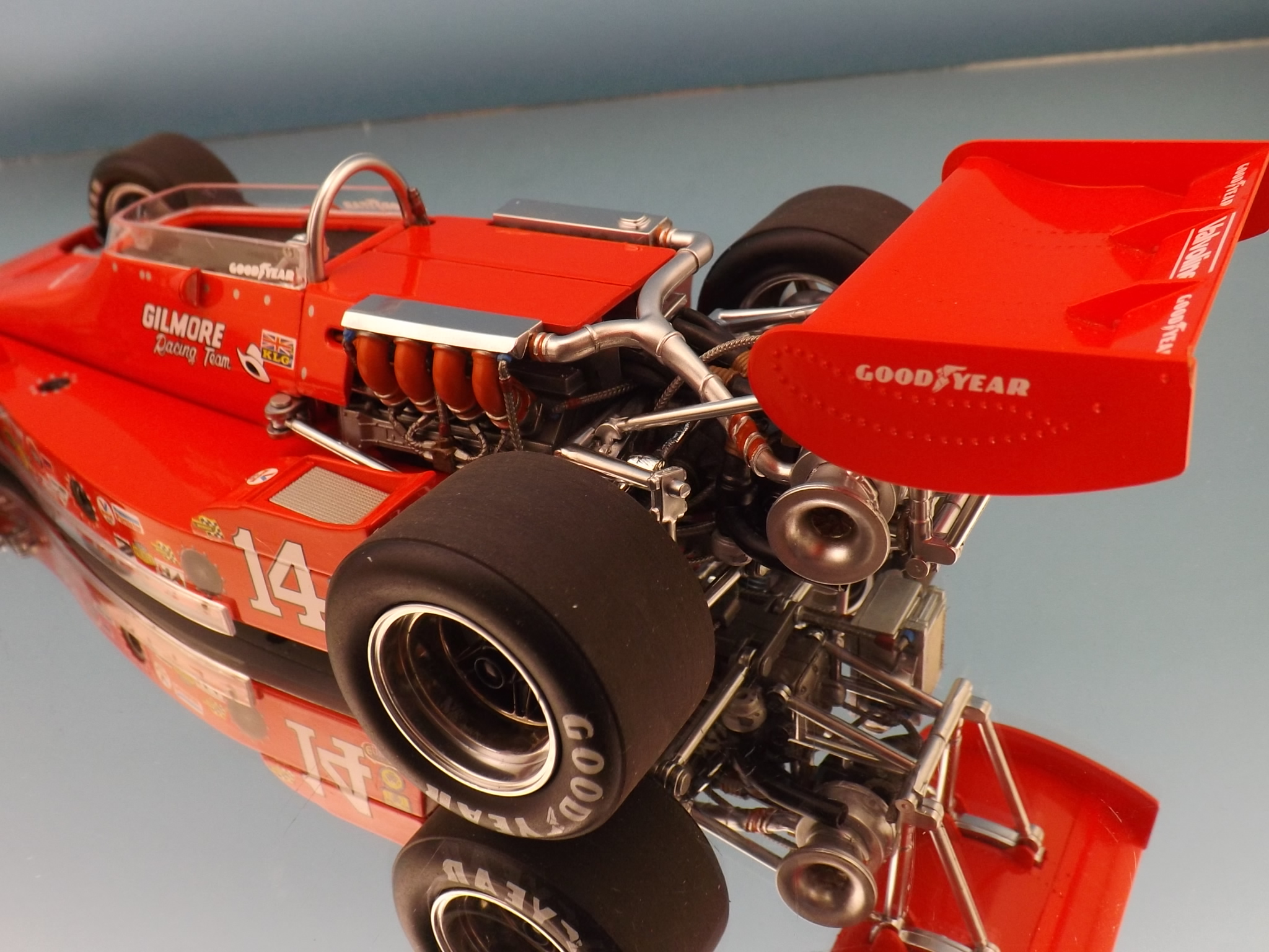 The giant turbo in back, plus black exhaust and rear mounted radiator are finely detailed too as are the front and rear suspension pieces, brakes and braided cables running to each wheel’s brakes. Atop the side pods are metal grates that cover the air ducts just in front of the giant rear slicks, Goodyears, of course. Goodyear was the sole tire supplier for Indy Cars by 1975 as Firestone phased itself out in 1974. A.J. was solid with Goodyear.