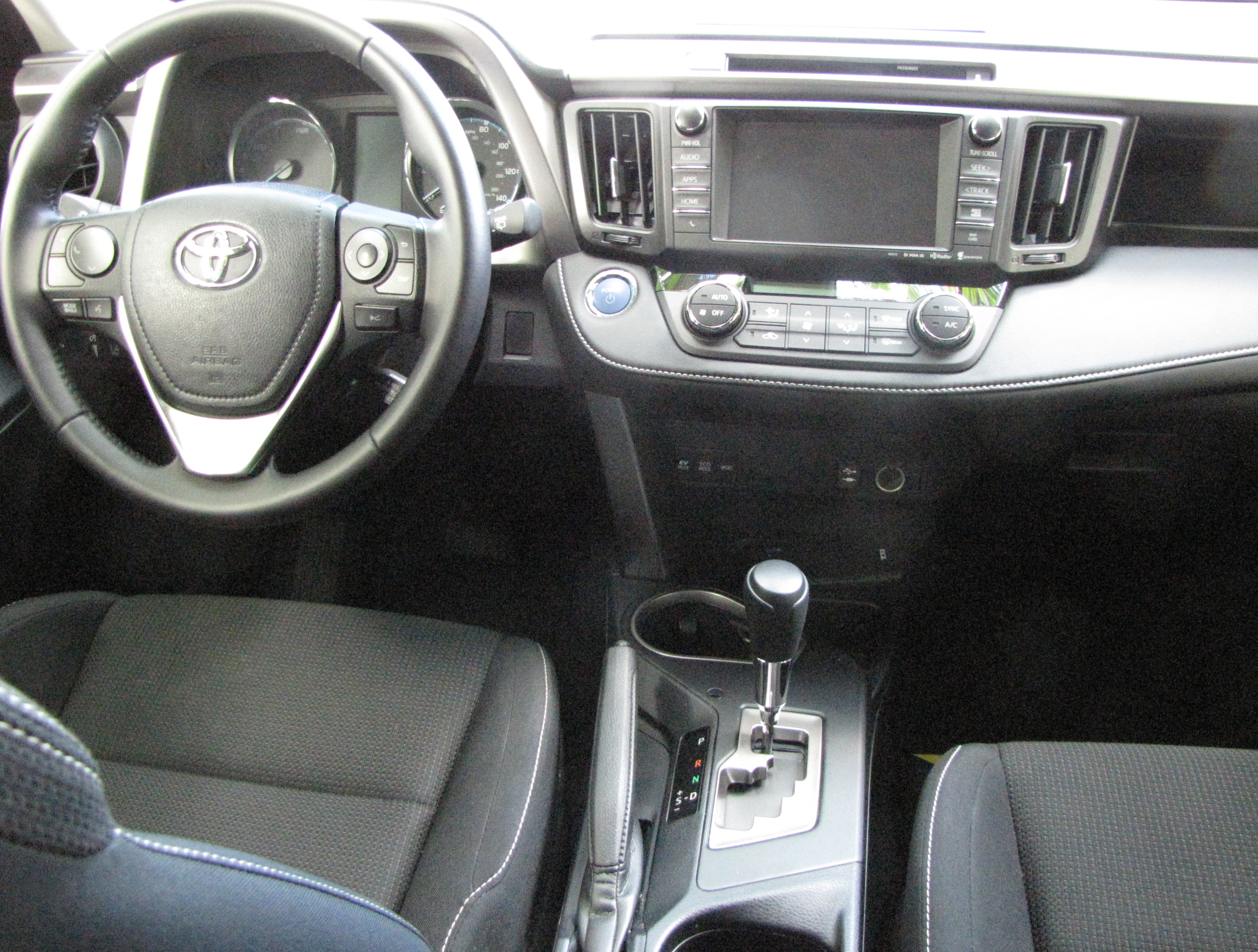 Inside, I liked the RAV4’s layout and interior, beyond its cheap feeling visors (with extenders) and center console storage bin. The test vehicle was a dark metallic gray XLE, not the top-level Limited, so no leather seats.