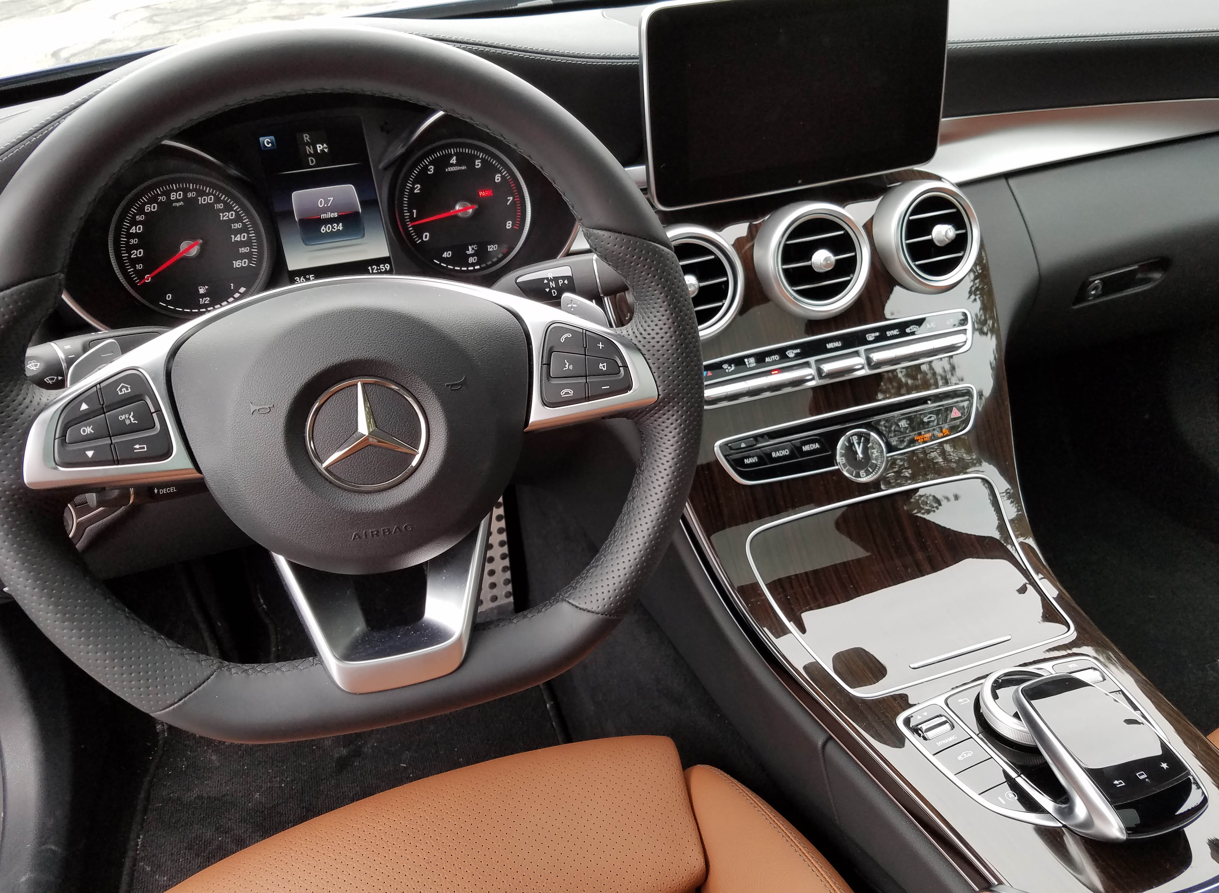 I like the dash’s overall layout with main gauges easy to see and a power tilt/telescope steering wheel to help get it aligned perfectly for driving comfort and visibility. The C300 has big toggles on the center stack for climate controls, plus large buttons for navigation, radio and media.