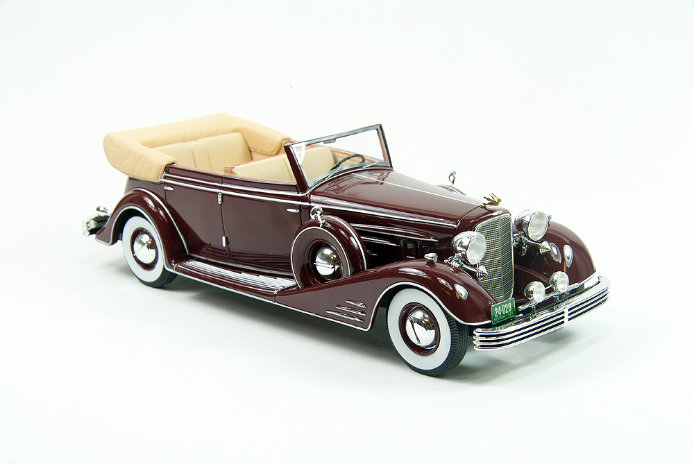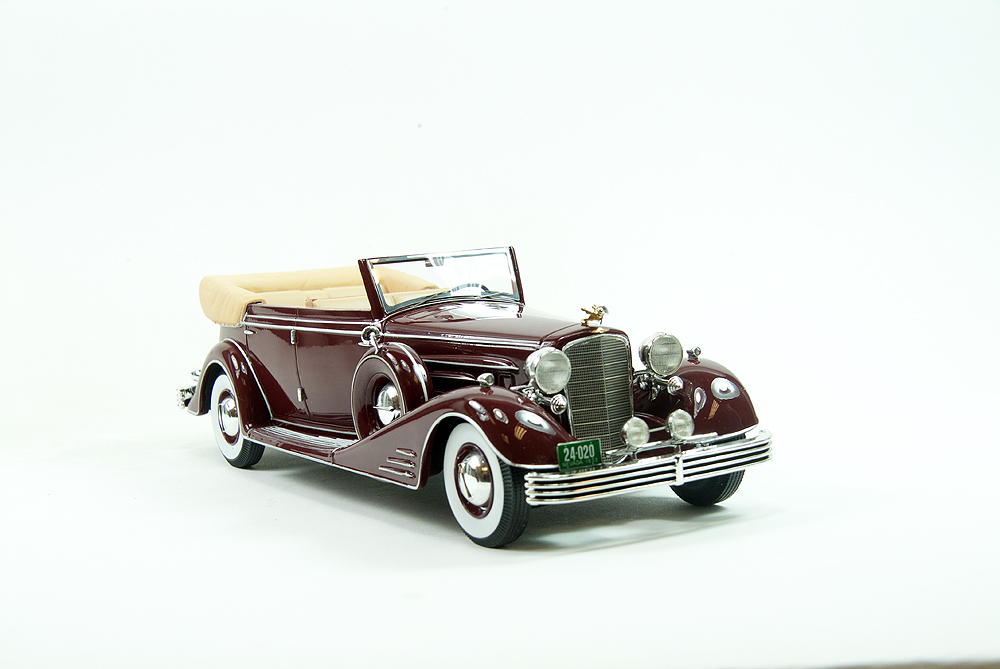 In 1933 the sexy V-16 Fleetwood’s body featured three horizontal hood vent spears, partially obscured by the covered spare tires in each fender, plus three chrome strikes on its fender skirts. The car also had unique four-bar bumpers front and rear, fancy multi-cones horns under the chrome lights, plus chrome wheel covers with a bar across them to draw attention to them as they spun. NEO’s model faithfully reproduces all of the Fleetwood’s unique styling features.