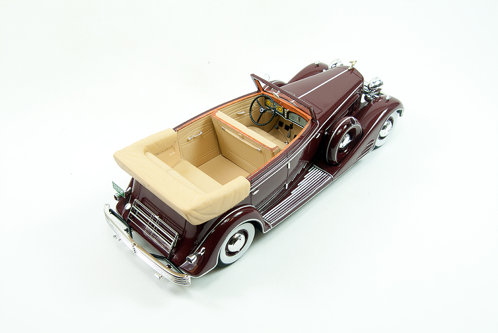 Lights, bumpers, horns, turn signals, mirrors and door handles are all chrome and in back the Fleetwood features a beautifully sculpted photo-etched luggage rack that is impressive. Equally sharp is the gold winged hood ornament. A spare one along with two extra rearview mirrors that mount on the spare tire cases are provided lest you break one while handling the model.