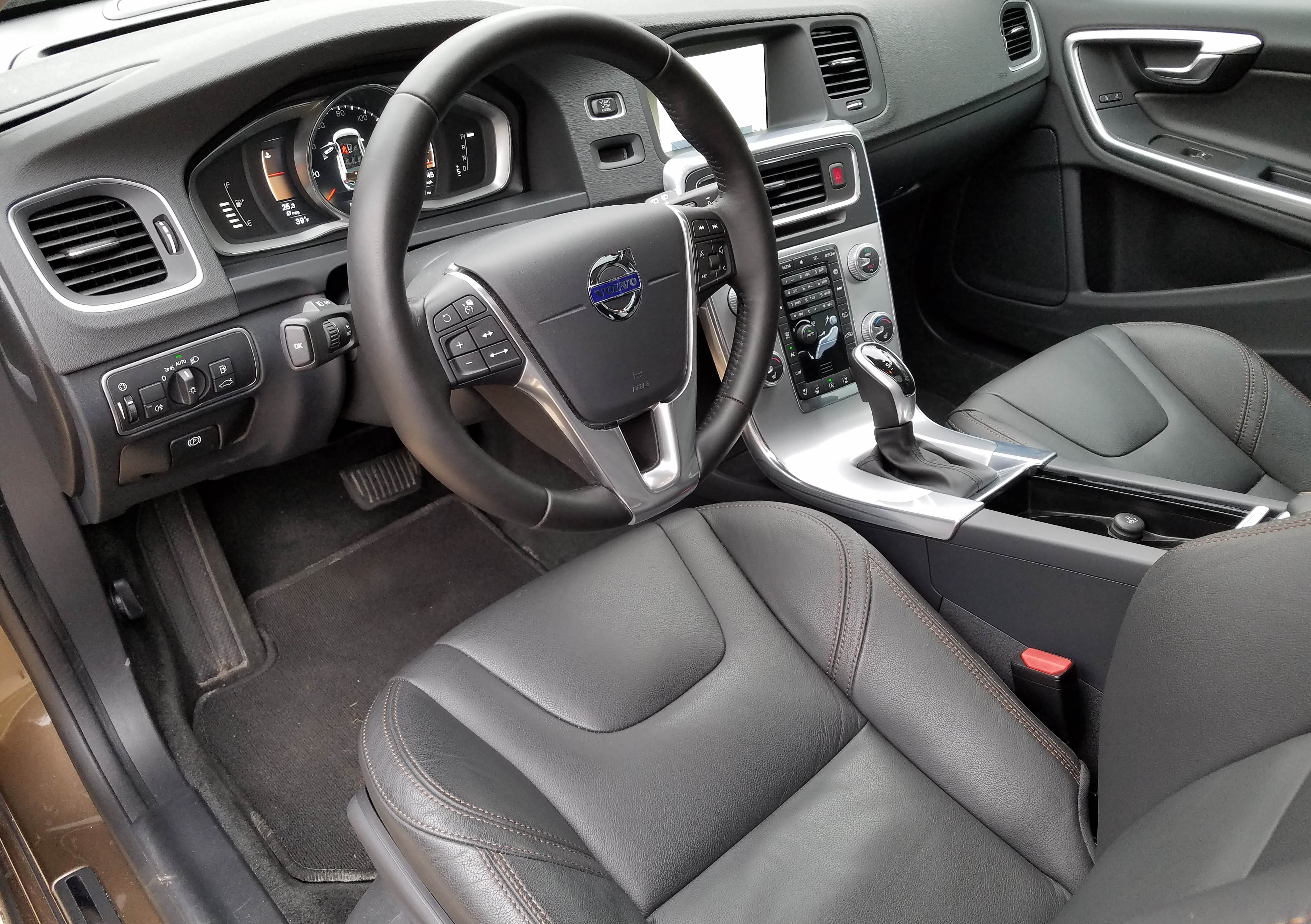 Inside, the V60 looks luxurious and stylish. This one had a black leather interior with brown stitching that reflected the car’s exterior color. Satin chrome trims the doors and center stack with a textured stack face.