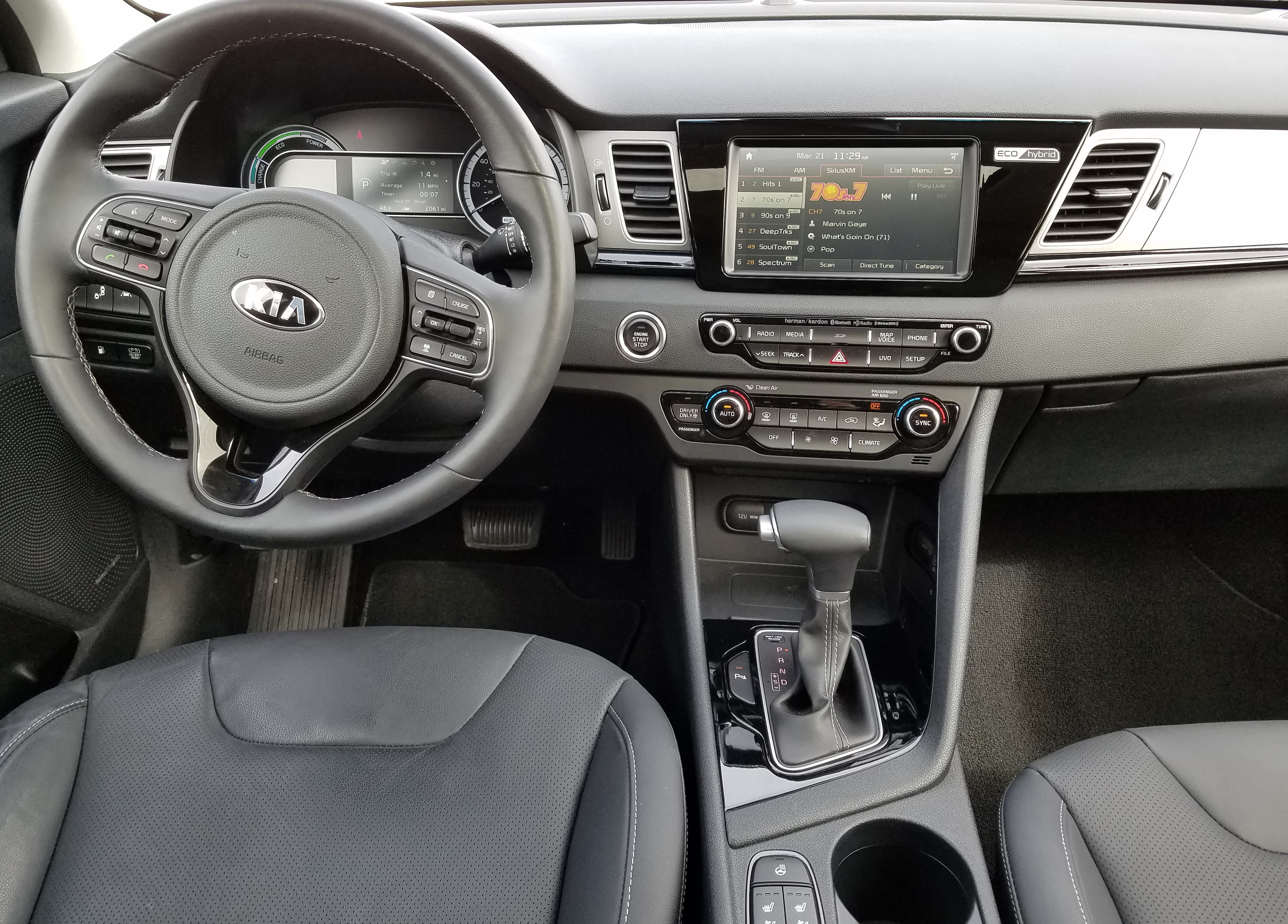 Niro has a manual tilt/telescope steering wheel with the usual cruise control, trip computer, radio and phone controls on its hub. The steering wheel also is heated, it and the seat climate controls being conveniently found on the console, not several screens in on the main dash screen as more pricey cars and crossovers prefer.