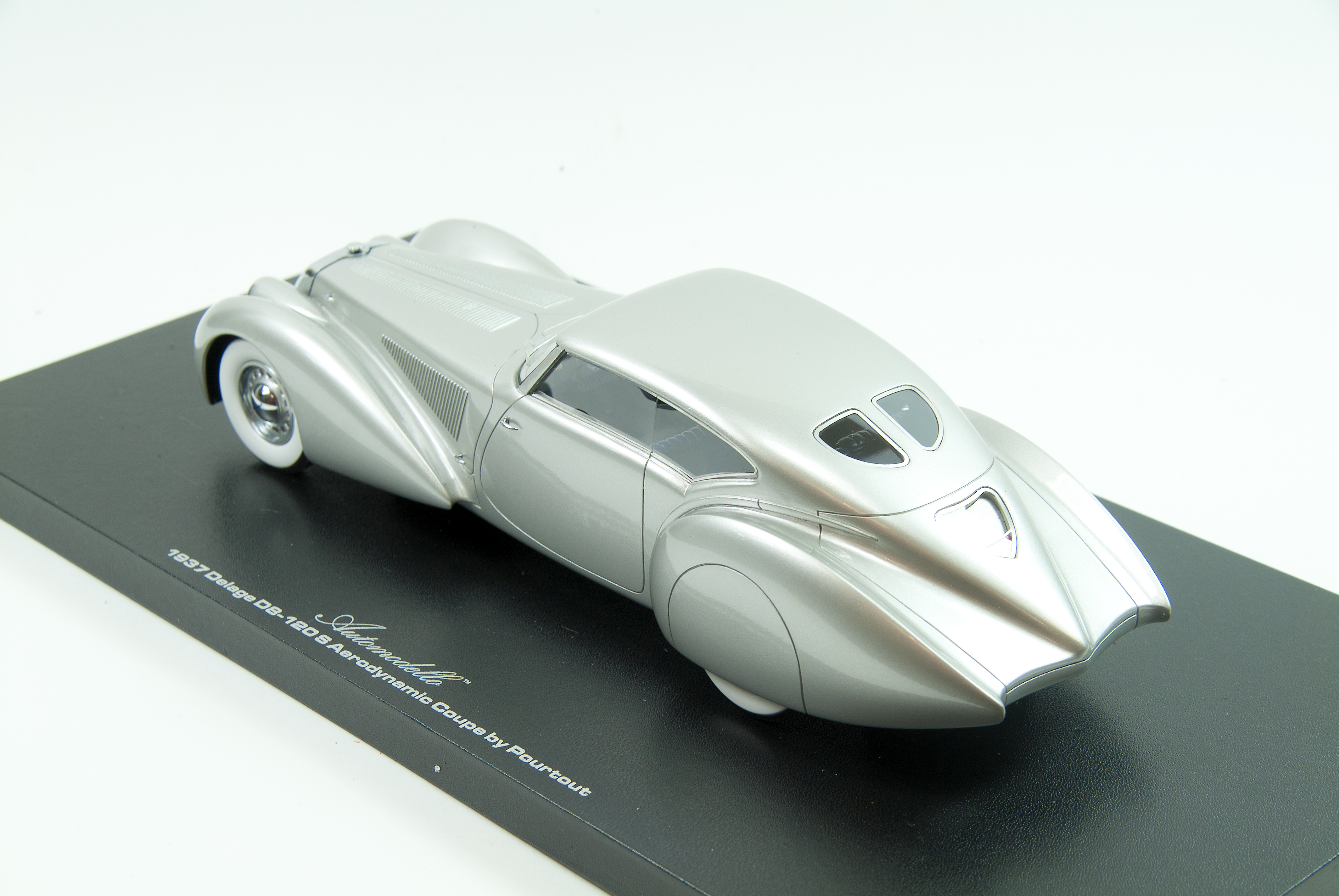 Accenting the car are wide white-sidewall tires, but due to those swanky rear fenders with wheel well covers you only see the front tires fully. Likewise you see the finely detailed Delage wheels with big chrome hubcap with the Delage name on it in blue, the French racing color, by the way.