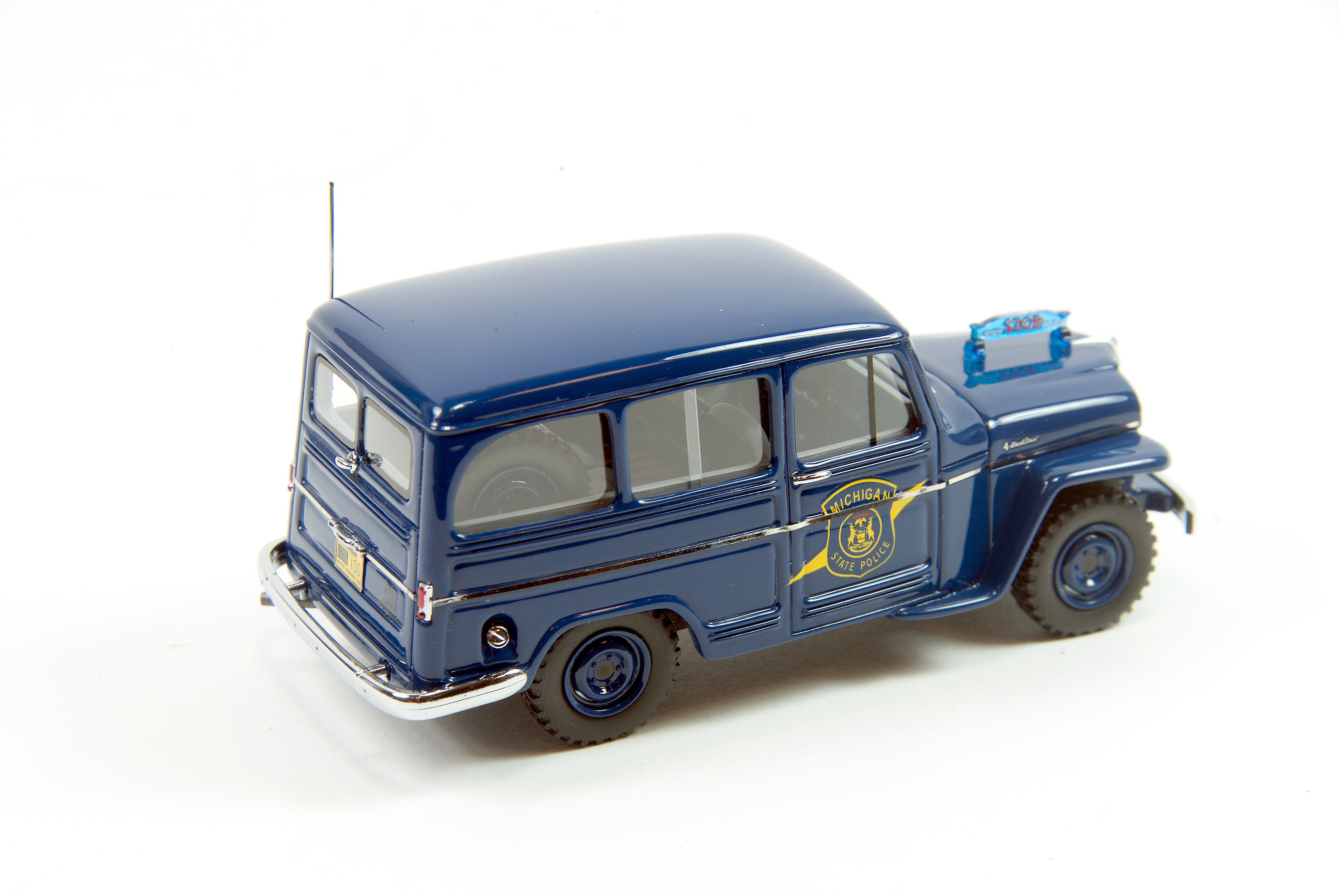 There are chrome wipers, a side mirror and grille up front and rear window lift handle on the tailgate. The model features Jeep’s V-shaped grille with five horizontal bars, which was introduced in 1950. Lights front and rear are realistic and the Willys carries a yellow Michigan, “Water Wonderland,” license plate front and rear. All windows are posed in their closed positions and there’s black trim on the front and rear windows to set them off from the dark blue body’s paint.
