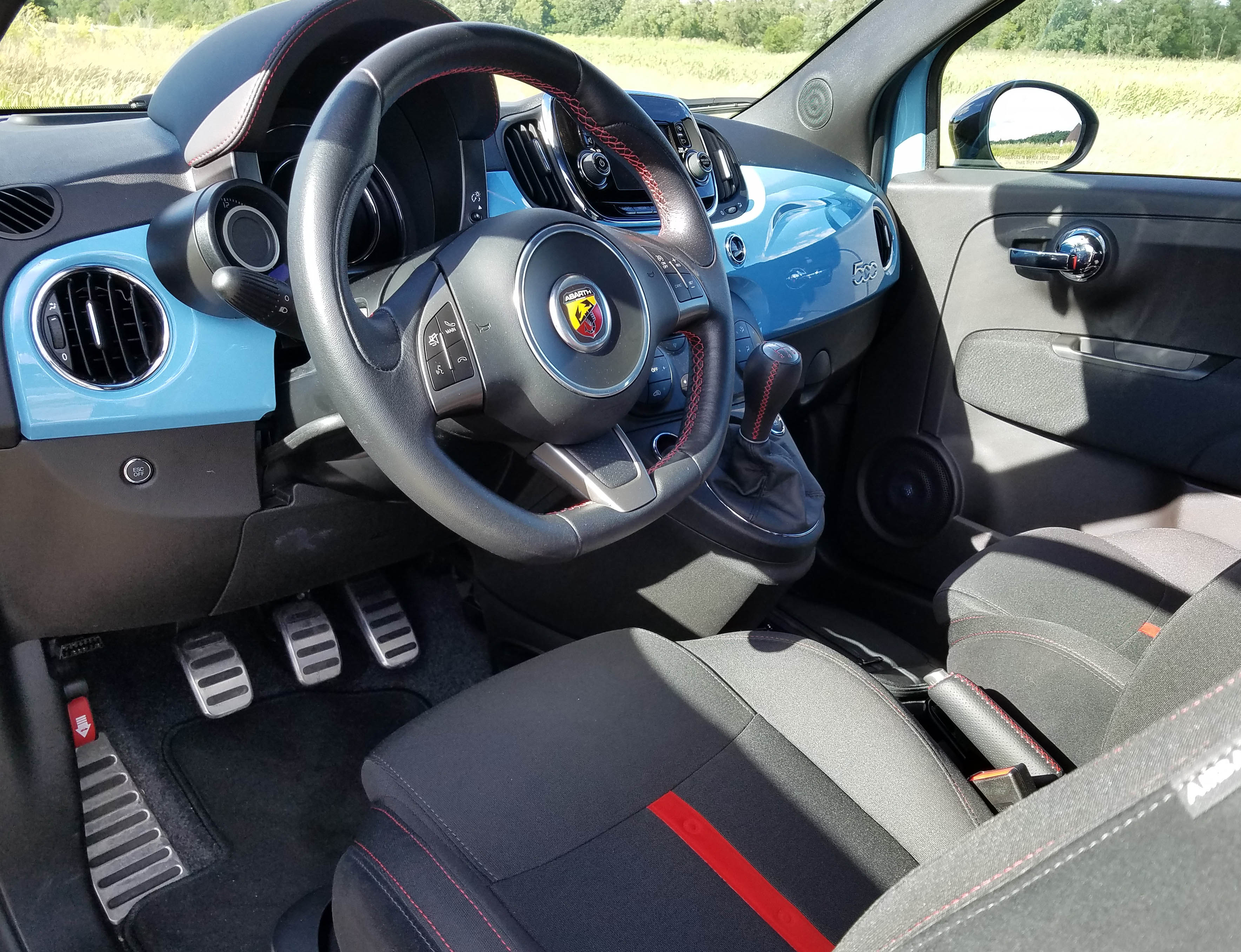 The Abarth adds a racy and practical flat-bottomed leather steering wheel. That provides more leg and knee room when entering and exiting the car. Looks cool too!