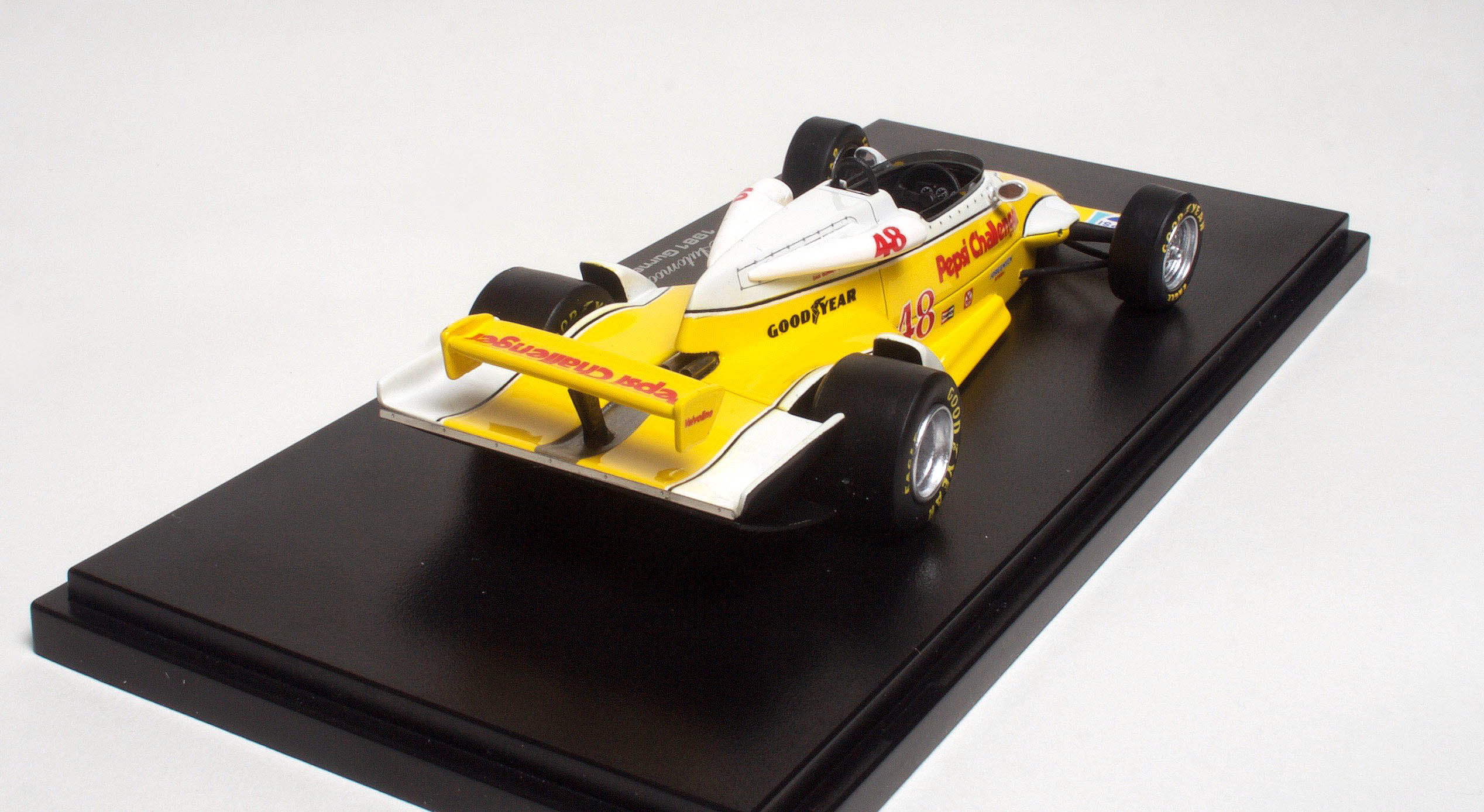 Automodello creates both Mosley’s No. 48 Indy 500 car and the same car as driven later in the year to a pole position start at Riverside Raceway by Geoff Brabham. Both are bright yellow and white Pepsi Challenger models.