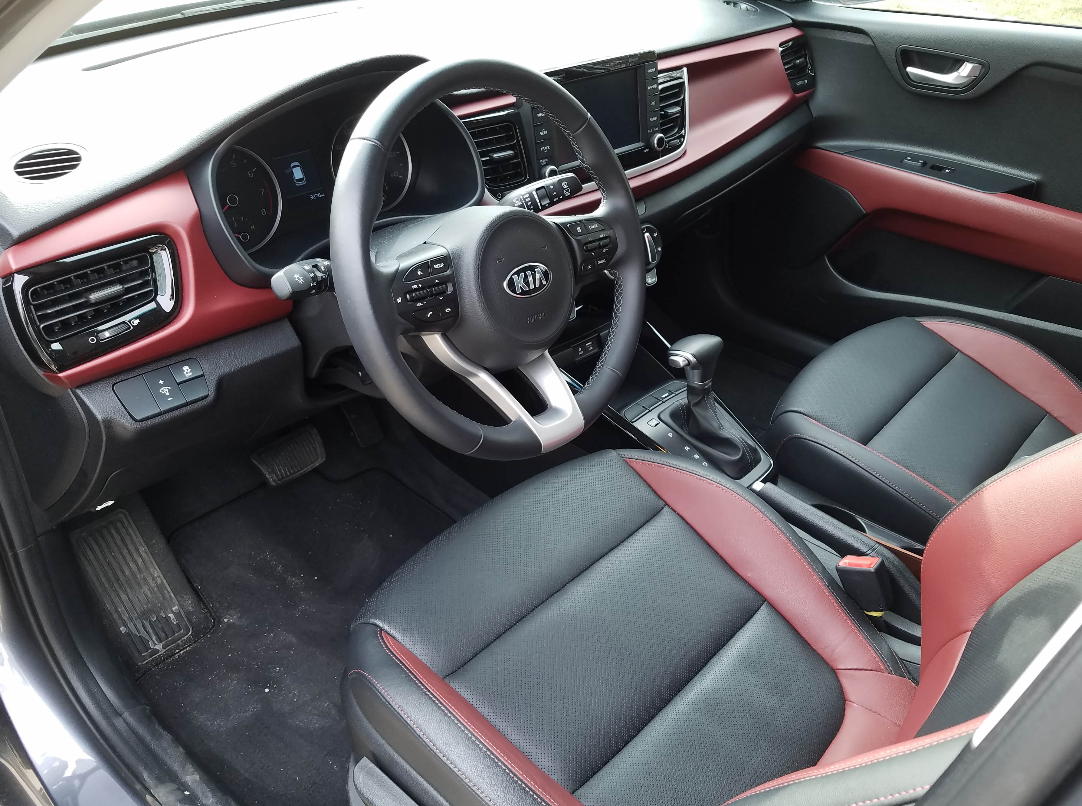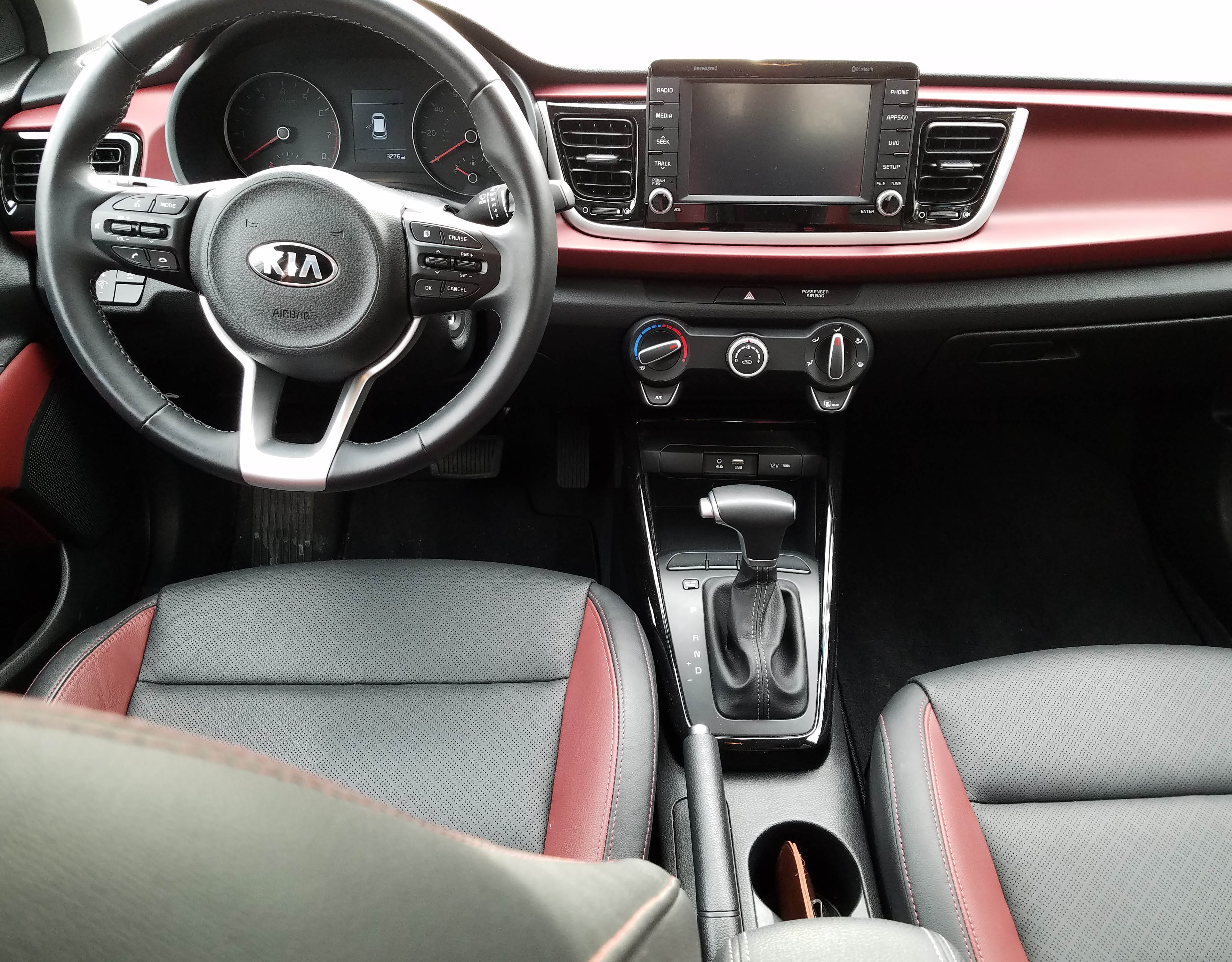 Inside, the Rio delivers a completely sporty look that makes the nicely styled Accent interior seem boring. Here’s why. The test car added the EX Launch edition package available on early Rio models this year. It costs $500, but puts red accents on the doors and dash and red leather seat trim. This looks sharp and got a 20-something co-worker to declare he “loved” the interior.