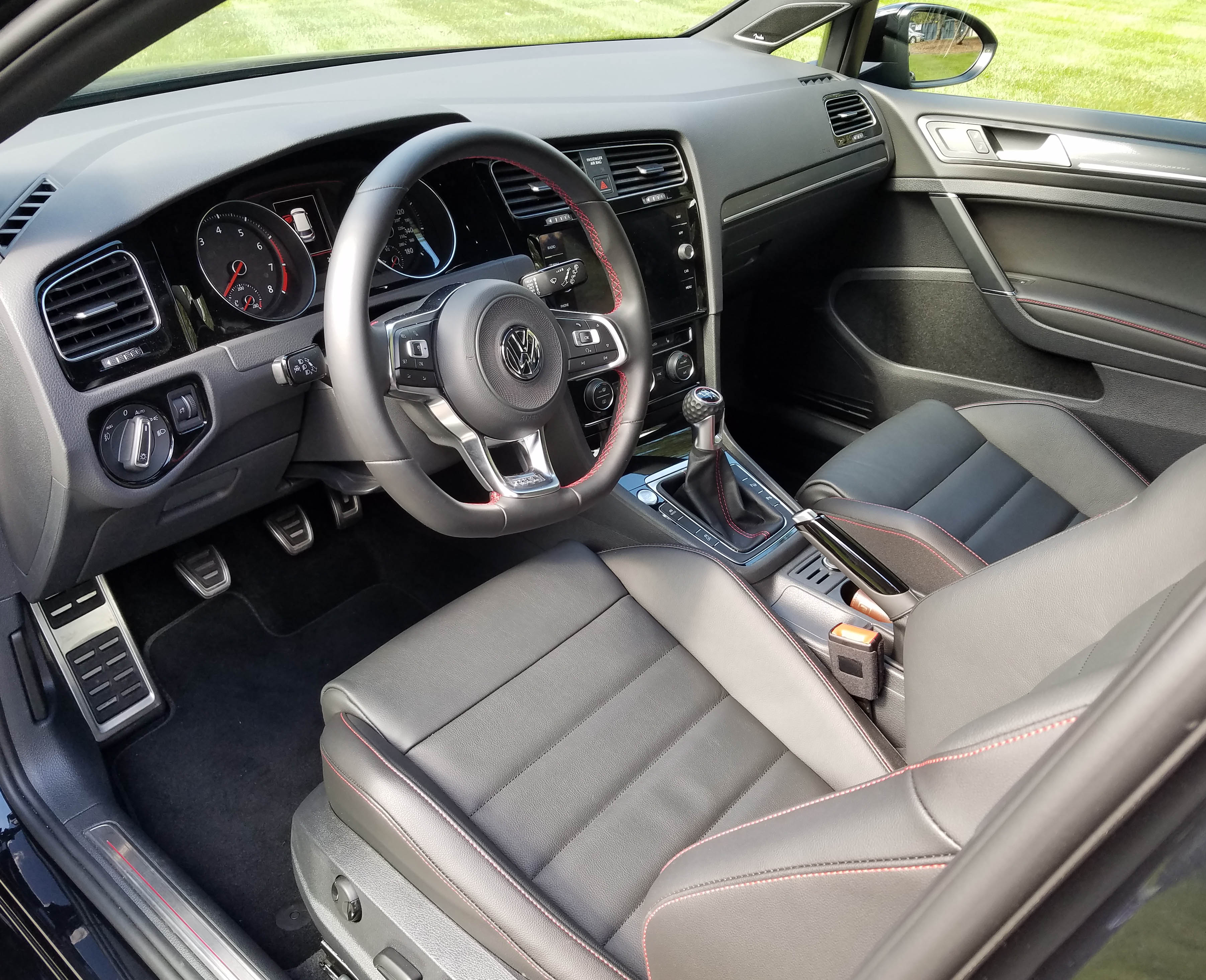 VW doesn’t disappoint inside as it wraps its form-fitting sport seats in black leather and embroiders them with GTI on the seat backs, plus adds red stitching to accent the fun. The thick leather steering wheel also wears red stitching.