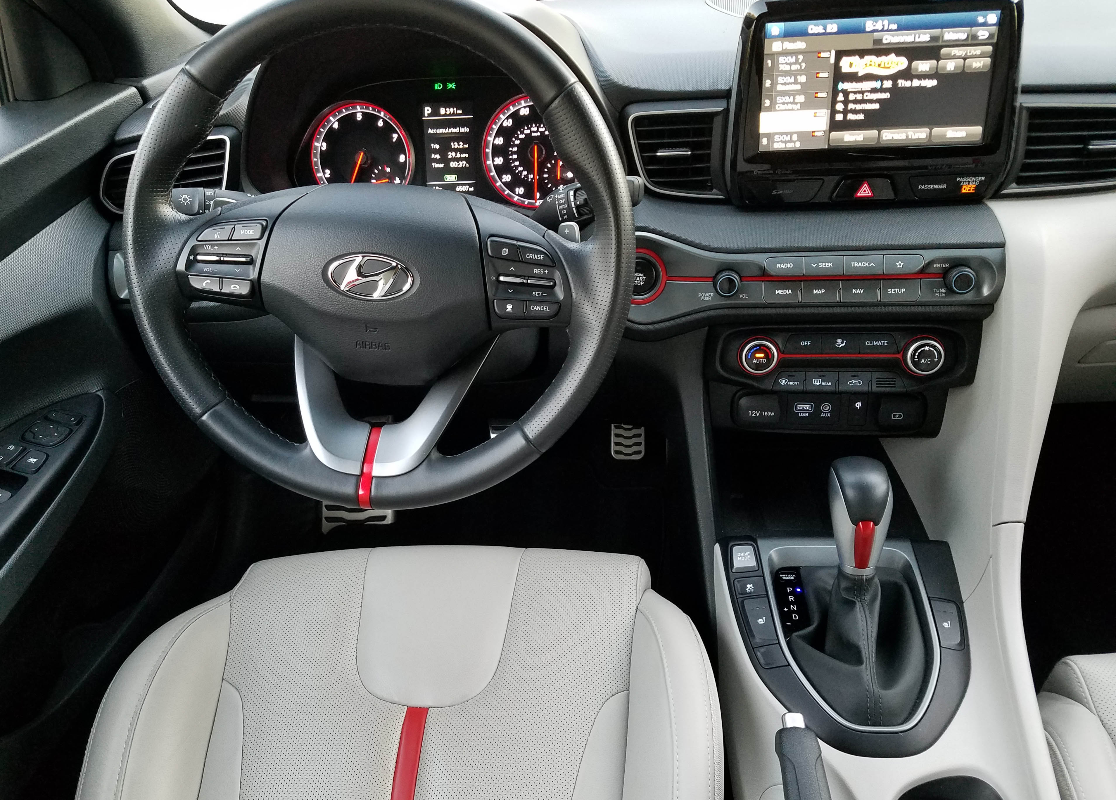 Inside you’ll feel comfortable and well-tended to and appreciate the stylishness for the car’s modest price. The red test car with its black roof featured a black dash over oatmeal lower portion and the seats were oatmeal with a red stripe down the center for a smidge of youthful racy looks. That red accent stripe also is repeated in the shifter, dash and steering wheel hub.
